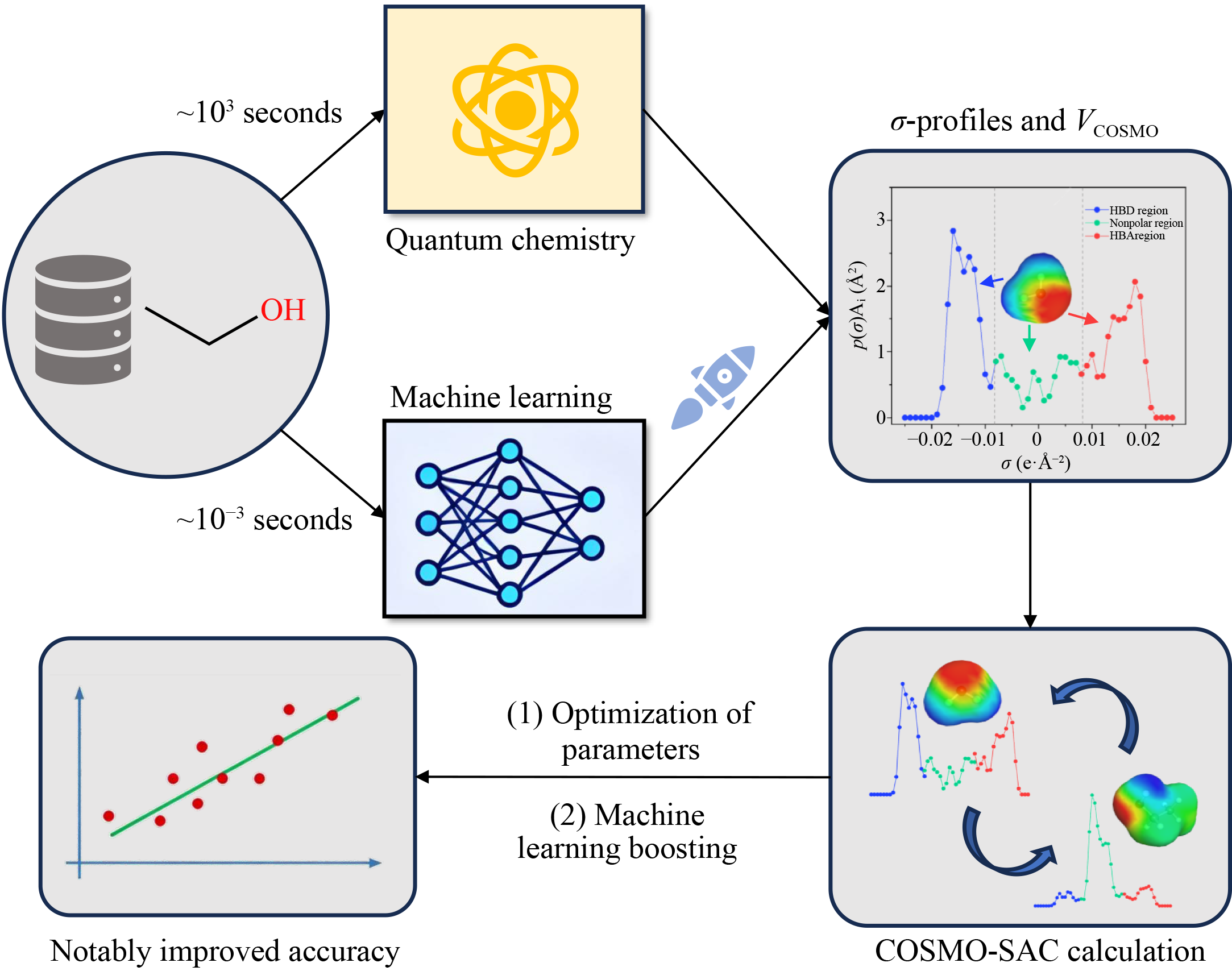 Infinite dilution activity coefficient (γ∞) is a key thermodynamic parameter in solvent design for chemical processes. Although conductor-like screening model for segment activity coefficient (COSMO-SAC) exhibits strong prior predictive capabilities, its estimations are sometimes only qualitative rather than quantitative. Another limitation of COSMO-SAC arises from the reliance on time-intensive quantum chemistry calculations, which restricts its scalability for large-scale solvent screening. To overcome these issues, this study integrates COSMO-SAC with machine learning for accurate γ∞ prediction of binary mixtures. By bypassing the necessity for quantum chemistry calculations, the multi-task machine learning model could rapidly predict the surface charge density distribution (σ-profiles) and molecular cavity volume (VCOSMO) of molecules and ions, while accurately distinguishing isomers. Four adjustable parameters of COSMO-SAC are optimized using more than 20000 experimental data points of γ∞, and residual systematic errors are further corrected with the boosting ensemble strategy to improve the model performance. The resulting hybrid model reduces the mean absolute error from 0.944 to 0.102 (R2 = 0.969), representing an 89 % improvement, while preserving the physicochemical interpretability of model. This accurate and efficient approach broadens the practical applicability of σ-profiles and VCOSMO prediction, as well as γ∞ calculations based on COSMO-SAC, facilitating the high-throughput solvent screening for diverse chemical engineering applications.