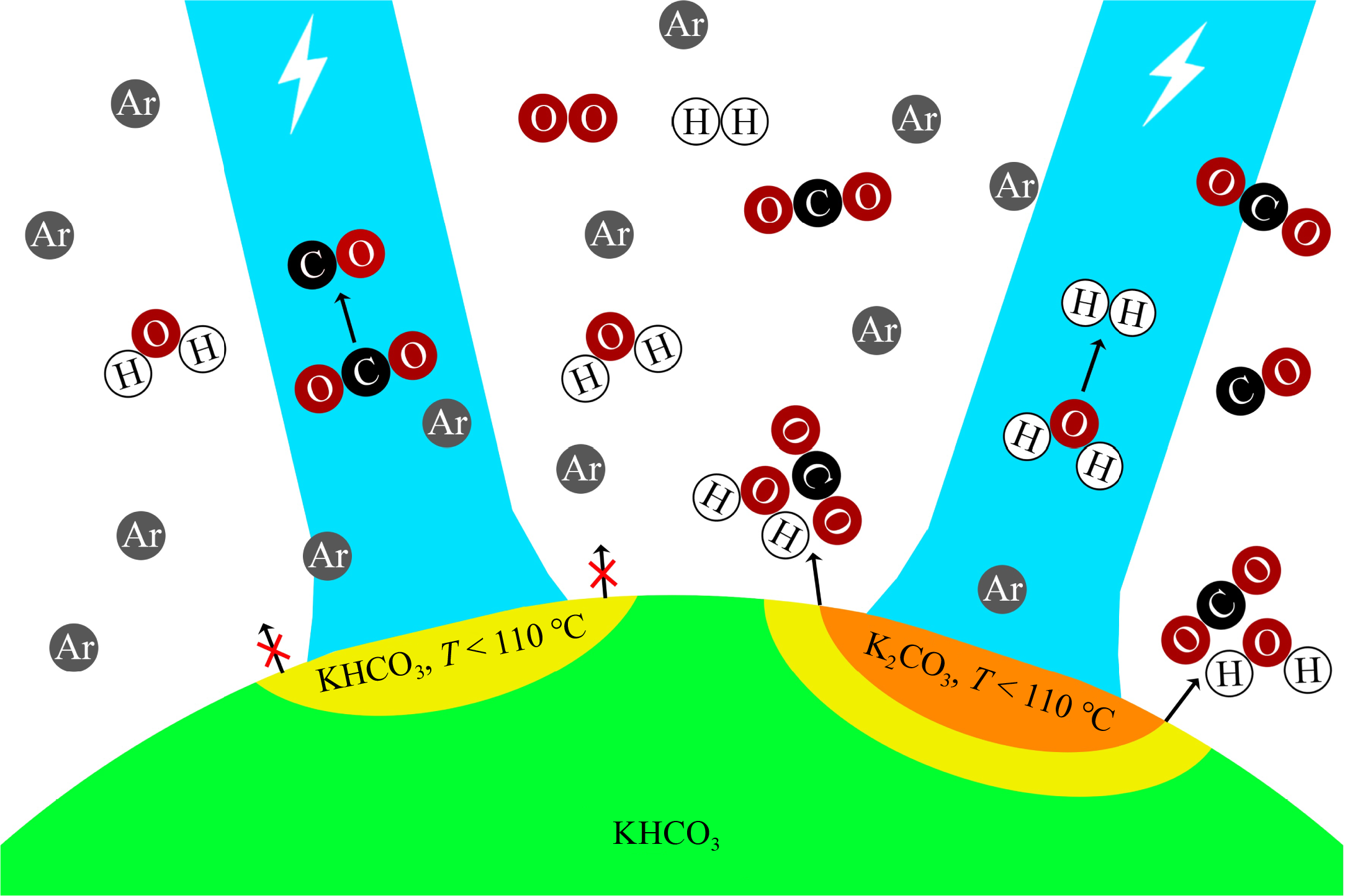 The carbonation of K2CO3 to KHCO3 is an interesting CO2 capture process due to its low material cost, high selectivity, and substantial CO2 capacity. Traditionally, KHCO3 is regenerated into K2CO3 through thermal decomposition. However, plasma-assisted decomposition presents a promising alternative, enabling not only CO2 desorption but also the concurrent production of valuable products such as H2 and CO. In this study, KHCO3 particles in a size range of 250–355 μm were packed in a dielectric barrier discharge reactor and exposed to plasma. It was found that the decomposition of KHCO3 in the plasma reactor is mainly driven by a thermal mechanism, and the decomposition rate was controlled by temperature increase via plasma heating. The energy consumption for decomposition is more than one order of magnitude higher compared to the thermal approach reported in the literature. However, production of CO and H2 was achieved during plasma treatment, highlighting the potential advantage of an integrated CO2 capture and utilization process, and the best CO2 conversion and energy efficiency achieved were 9.0% ± 0.2% at 3.0% ± 0.1% with a syngas ratio of 0.35 ± 0.01.