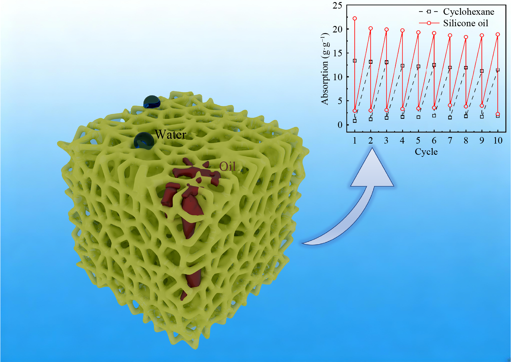 Addressing the growing challenge of oil pollution, this study presents a green and efficient strategy for fabricating biodegradable poly(lactic acid)/poly(butylene adipate-co-terephthalate)/talc (PLA/PBAT/Talc) composite foams with high volume expansion ratio (VER), excellent compression resilience, and superior oil absorption performance via synergistic melt blending and supercritical CO2 (scCO2) batch foaming. By strategically incorporating PBAT (10 wt %) and talc (3 wt %) into the PLA matrix, and by optimizing the foaming temperatures, the melt strength and crystallization behavior were effectively tailored. The resultant PLA/PBAT-T3 foam achieved a VER exceeding 45 and an open-cell content (OCC) of 85%. Cyclic compression tests demonstrated that the PLA/PBAT-T3 foam fabricated at 100 °C exhibited the lowest permanent deformation, indicating superior structural integrity. Remarkably, the foam exhibited equilibrium oil absorption capacities (Qt) of 22.2 g·g–1 for silicone oil and 13.4 g·g–1 for cyclohexane. A significant correlation was established, revealing that Qt is directly proportional to the multiplication of VER and OCC. The foam also demonstrated excellent reusability, retaining over 85% of its initial absorption capacity after 10 consecutive absorption-desorption cycles. This work provides a viable strategy for engineering biodegradable and recyclable oil-sorbent materials, while also advancing the application potential of PLA-based composites in sustainable environmental remediation technologies.