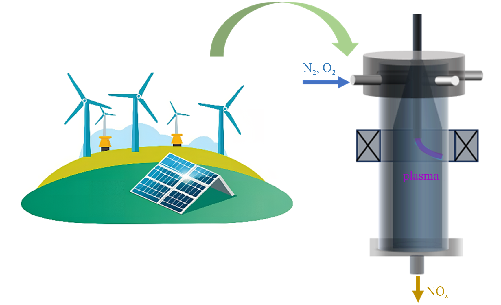 A rotating gliding arc (RGA) device driven by synergistic flow and magnetic fields was developed for enhanced nitrogen fixation. The effects of flow field distribution, magnetic field intensity, and N2/O2 ratio on fixation performance were investigated. A uniform tangential inlet improved arc stability, suppressed reverse breakdown, and extended the operating range of the RGA, resulting in the highest fixation efficiency. At an air flow rate of 3 L∙min–1, the device achieved an NOx concentration of 7623 ppm in the effluent, with an energy cost as low as 3.6 MJ·mol–1. This configuration also enhanced plasma non-equilibrium, promoting nitrogen excitation and reactive species generation. Increasing magnetic field strength improved efficiency up to 200 mT, beyond which gains plateaued. An N2/O2 ratio of 6:4 yielded optimal nitrogen excitation and fixation performance.