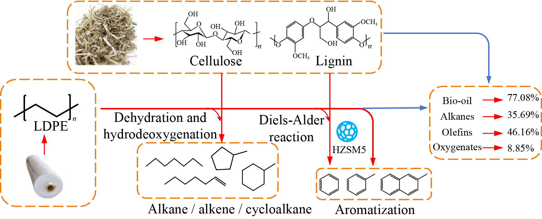 This study investigates the co-pyrolysis behavior and product distribution of peanut straw and polyethylene film blends through thermogravimetric analysis and gas chromatography-mass Spectrometry. Thermogravimetric analysis results revealed distinct pyrolysis temperature intervals: 247–356 °C for peanut straw, 448–505 °C for polyethylene film, and an extended range of 247–510 °C for their mixtures. Synergistic effects, quantified through experimental-theoretical deviations, demonstrated enhanced mass conversion rates and accelerated pyrolysis kinetics in blended systems. As the mass ratio of peanut straw to polyethylene increases from 1:1 to 1:7, the bio-oil yield increased from 62.1% to 76.86%, accompanied by elevated alkane from 20.84% to 31.41% and olefin from 24.73% to 42.89%. HZSM-5 catalyst further optimized product profiles, achieving 77.08% bio-oil yield with enhanced hydrocarbon selectivity (alkanes: 35.69%; olefins: 46.16%) while suppressing oxygenates from 20.07% to 8.85%. Carbon chain distribution analysis indicated a polyethylene ratio-dependent shift toward short-chain alkanes (C6–C19), with HZSM-5 intensifying this trend through selective cracking of long-chain species (C20+). These findings establish that co-pyrolysis with catalytic intervention effectively promotes hydrocarbon production and inhibits oxygenated compounds, providing strategic insights for agricultural plastic waste valorization.