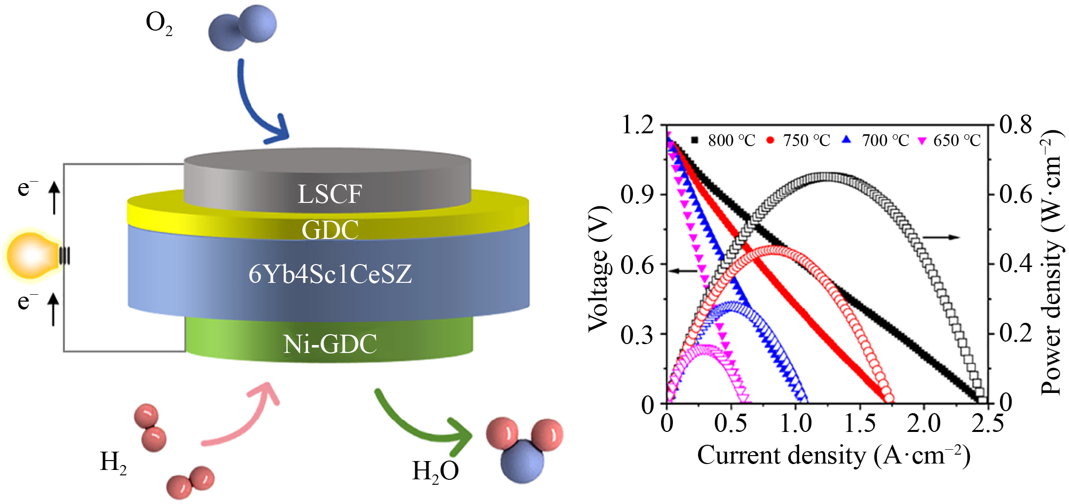 (Sc2O3)0.1(CeO2)0.01(ZrO2)0.89 possesses excellent ionic conductivity among various stabilized ZrO2 electrolyte materials for solid oxide fuel cells. However, its practical application is limited by susceptibility to phase transition and the high cost of Sc2O3 raw material. Herein, we address these challenges by partially replacing Sc2O3 in (Sc2O3)0.1(CeO2)0.01(ZrO2)0.89 with low-cost Yb2O3. Quaternary (Yb2O3)x(Sc2O3)0.10‒x(CeO2)0.01(ZrO2)0.89 (x = 0.04−0.10) electrolyte discs are fabricated by coupling tape casting and in situ solid-state reaction. All Yb2O3 doped electrolytes exhibit a single cubic phase structure. With increasing in Yb2O3 amount, the grain boundary resistance decreases, leading to improved conductivity at low temperatures. (Yb2O3)0.06(Sc2O3)0.04(CeO2)0.01(ZrO2)0.89 exhibits the ionic conductivity of 0.088 and 0.0020 S∙cm‒1 at 800 and 500 °C, respectively. In addition, both the thermal expansion coefficient and three-point bending strength of the electrolytes increase with higher Yb2O3 amount, satisfying the criteria for advanced electrolyte materials in solid oxide fuel cells. A single cell configuration comprising a Ni-Gd0.2Ce0.8O1.9 anode|200 μm thick (Yb2O3)0.06(Sc2O3)0.04(CeO2)0.01(ZrO2)0.89|La0.6Sr0.4Co0.2Fe0.8O3 cathode achieves a peak power density of 0.65 W∙cm‒2 at 800 °C and operates stably for 100 h without noticeable degradation. The present findings provide a new approach for the development of cost-effective and highly conductive ZrO2-based electrolyte for efficient and durable solid oxide fuel cells.
