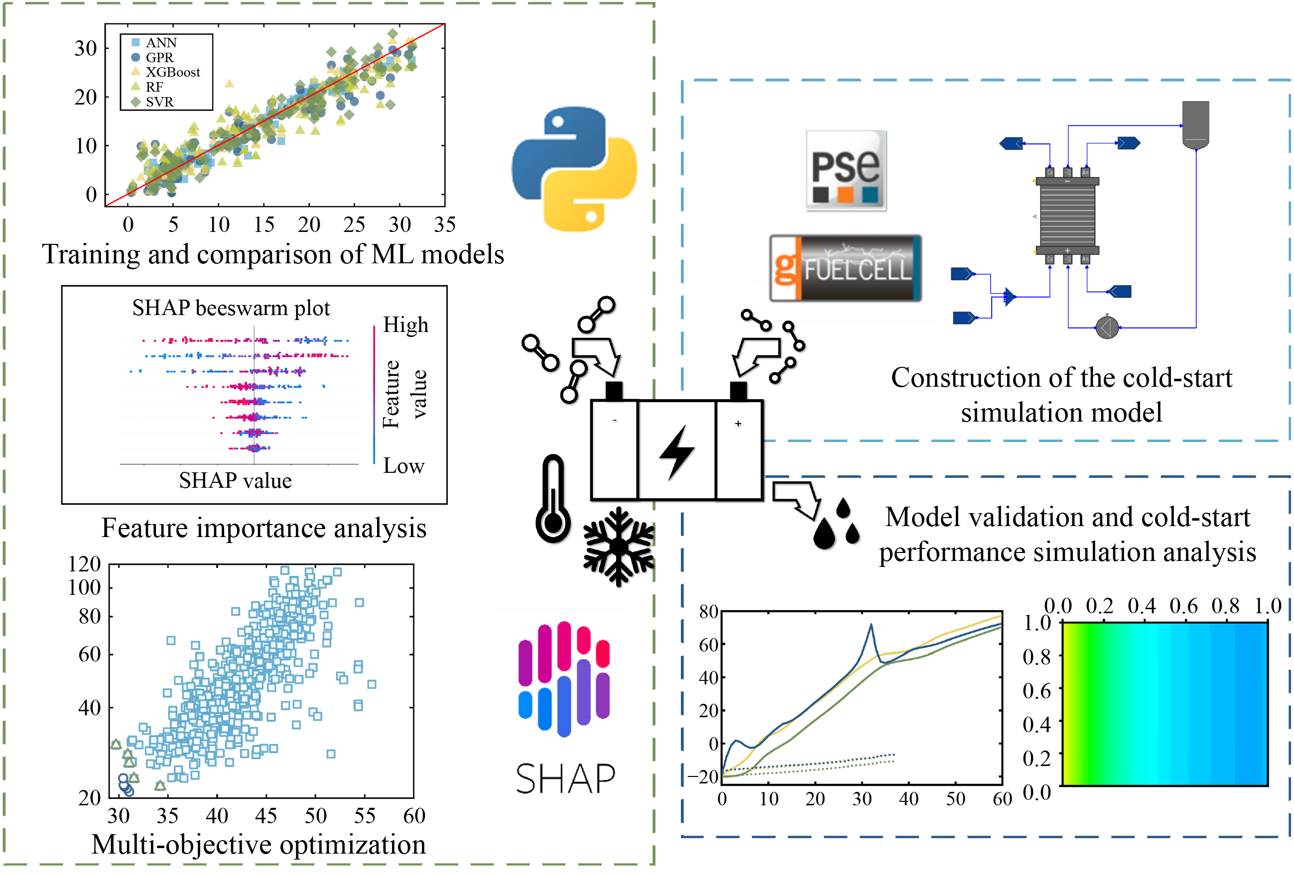 The start-up performance of proton exchange membrane fuel cells in low-temperature environments directly affects their service life and market promotion prospects. However, it is still challenging to fully understand how different operating parameters synergistically intensify the cold startup efficiency of proton exchange membrane fuel cells. In this study, the cold-start performance of proton exchange membrane fuel cells is optimized via cathode catalytic H2-O2 reaction heating, integrated with machine learning for key indicator prediction and multi-objective optimization for operating parameter screening. The proposed strategy achieves a temperature rise exceeding 30 °C without external load at –20 °C, suppressing the peak ice volume fraction in the cathode catalyst layer to 3.28 vol % and ensuring post-start stability. Machine learning models can predict key cold-start indicators with high precision. SHapley Additive exPlanations analysis further reveals the complex nonlinear interactions between parameters and clarifies the key factors affecting cold-start performance. Non-dominated Sorting Genetic Algorithm-II optimization identifies Pareto-optimal solutions, demonstrating enhanced cold-start efficiency via synergistic regulation of reactant supply, temperature elevation, controlled anode back pressure, and coolant flow. These findings provide guidance for the engineering design and parameter regulation of proton exchange membrane fuel cells in cold-climate applications.