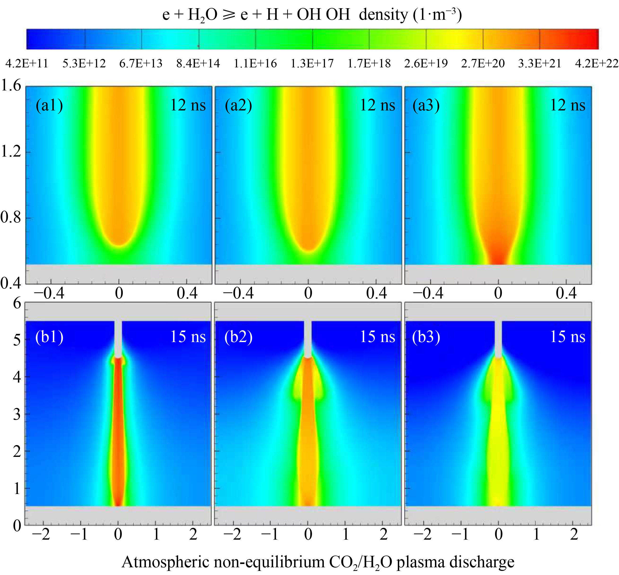 This study develops a two-dimensional fluid model for atmospheric pressure non-equilibrium CO2-H2O plasma needle-plate configuration, incorporating a comprehensive set of plasma chemical reactions and photoionization effects. It focuses on investigating the influence of the CO2/H2O concentration ratio and quenching pressure on plasma streamer initiation and propagation dynamics. Numerical simulations show that increasing initial water vapor content significantly reduces electron energy and density, causing the discharge channel to contract when the reduced electric field is below 200 Td, due to strong dissociative adsorption reactions between electrons and water molecules. At higher reduced electric fields (above 200 Td), variations in water vapor content have minimal impact on primary electron transport parameters, likely because dissociative and ionizing collisions between electrons and CO2/H2O molecules become dominant. Increasing the quenching pressure enhances photoionization, but plasma discharge remains primarily sustained by direct electron-impact ionization. Low initial water vapor content and elevated quenching pressure both accelerate streamer propagation, with the concentration ratio exerting a more significant effect. Finally, the primary reaction pathways for key products (CO, OH, and electrons) are analyzed. These findings contribute to a better understanding of how the reactant concentration ratio and quenching pressure regulate the discharge reaction mechanism in atmospheric pressure non-equilibrium CO2-H2O plasma.