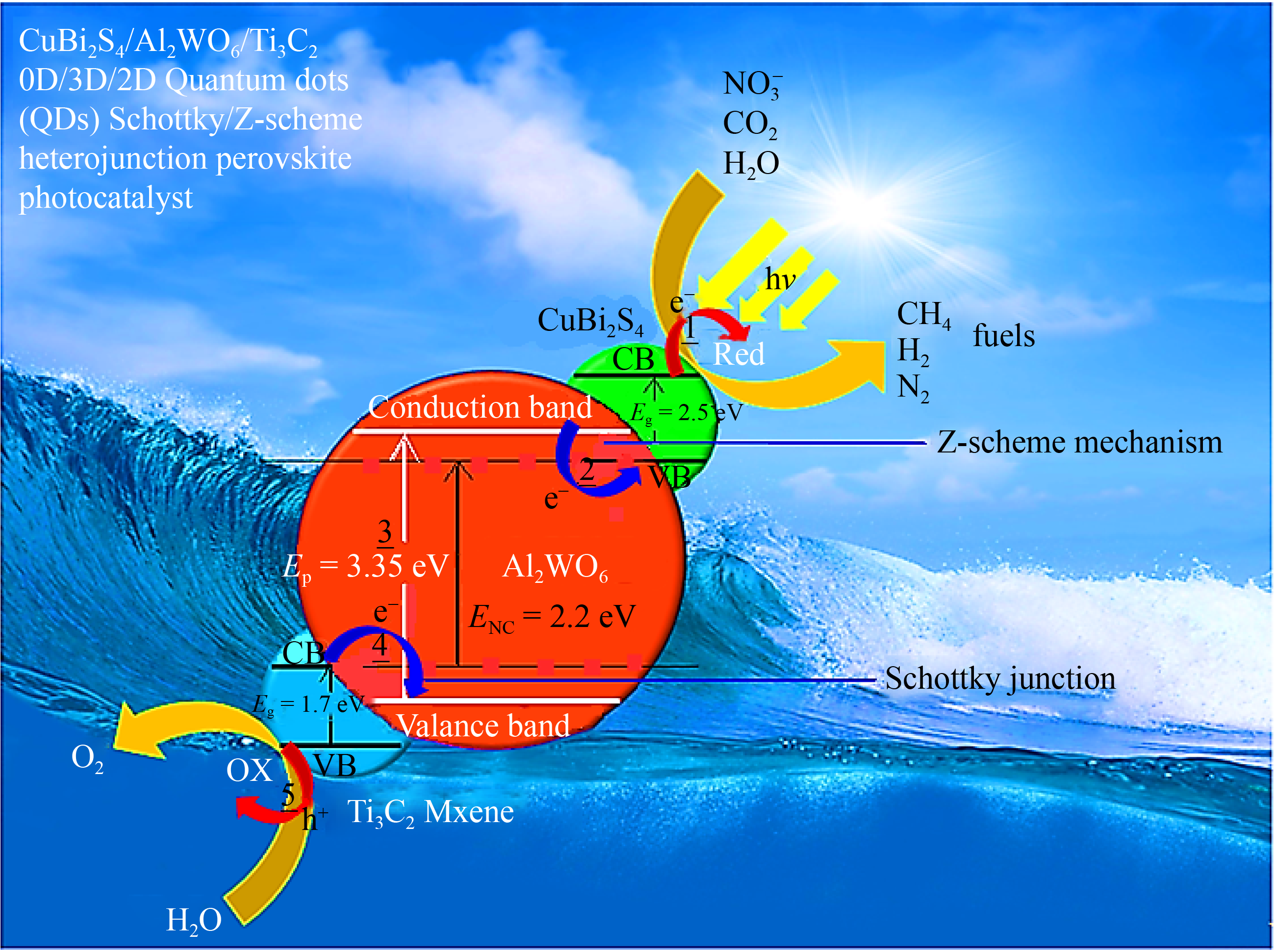 The photoreduction of environmental contaminants such as nitrate (NO3−) and carbon dioxide (CO2) into clean and renewable fuels has emerged as a key strategy for mitigating global environmental challenges, in which perovskite photocatalysts offer a promising, cost-effective, and sustainable solution. In the current research, a novel CuBi2S4/Al2WO6/Ti3C2 MXene Schottky/Z-scheme ternary heterojunction photocatalyst was synthesized and developed for the efficient photoreduction of nitrate and carbon dioxide, as well as photocatalytic water splitting under visible-light irradiation. The nanocomposite integrates three distinct components: (i) zero-dimensional (0D) CuBi2S4 quantum dot (QDs) nanoparticles (acting as a metal-assisted sulfide perovskite photocatalyst), (ii) three-dimensional (3D) aluminum tungstate (Al2WO6) double perovskite (serving as the central oxide perovskite photocatalyst), and (iii) two-dimensional (2D) Ti3C2 MXene (functioning as a non-metallic co-catalyst facilitating interfacial charge transfer). A comprehensive assessment of operating factors revealed their significant influence on the photocatalytic behavior of the CuBi2S4/Al2WO6/Ti3C2 ternary photocatalyst. The CuBi2S4/Al2WO6/Ti3C2 photocatalyst achieved a nitrate reduction efficiency of 80%, with nitrogen gas (N2) identified as the predominant reduction product (55% selectivity). The same catalyst also exhibited a CO2 photoreduction efficiency of 70%, in which methane (CH4) displayed the highest generation rate (13.87 mL∙g−1∙h−1; 619 μmol∙g−1∙h−1) corresponding to a 50% selectivity. Moreover, the composite demonstrated an impressive hydrogen evolution rate of 16 mL∙g−1∙h−1 (714 μmol∙g−1∙h−1) during photocatalytic water splitting with an efficiency of 60%. Furthermore, the ternary heterojunction photocatalyst exhibited excellent reusability and structural stability, retaining its photocatalytic performance over five consecutive cycles.