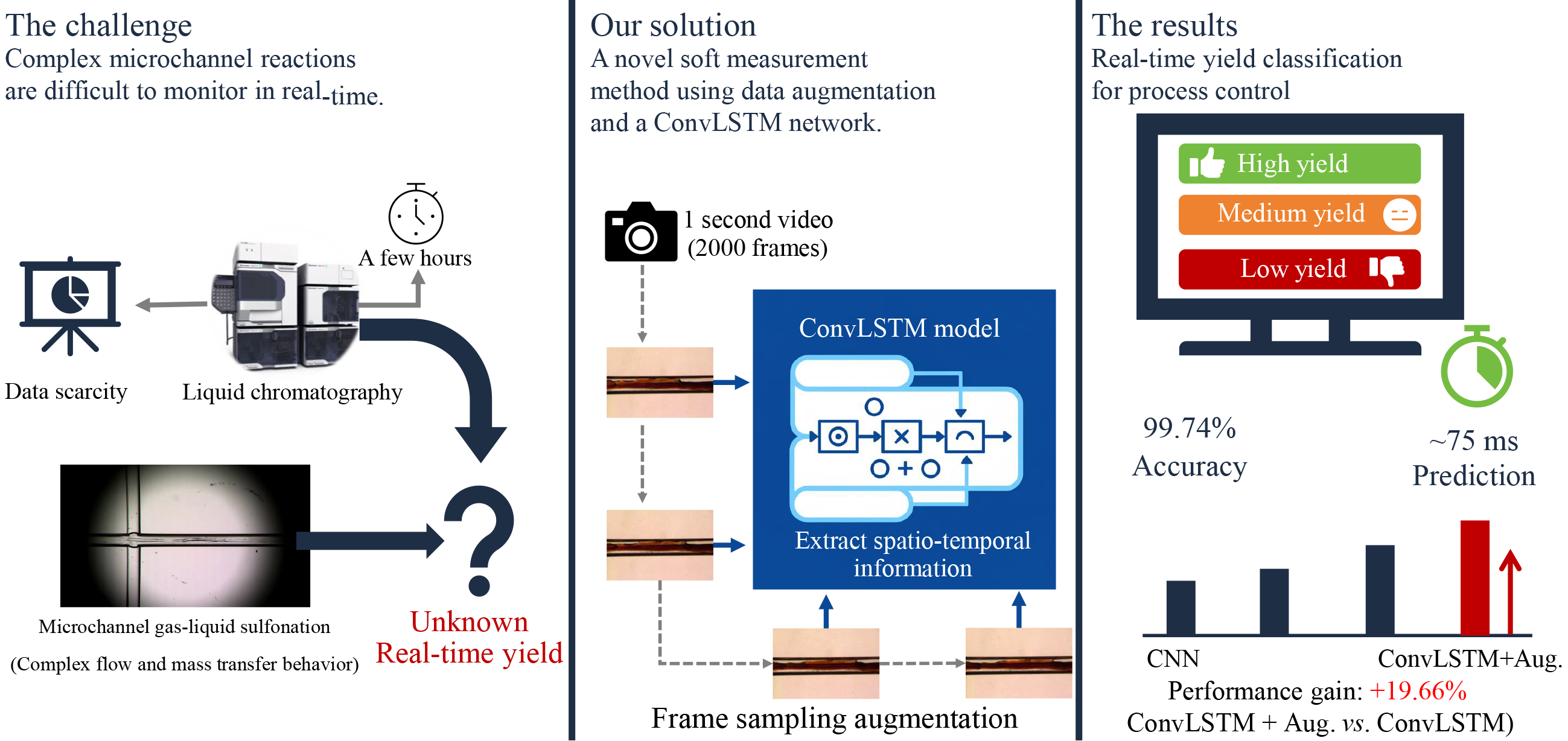 Real-time monitoring of gas-liquid sulfonation in microchannel reactors is challenging due to complex internal spatiotemporal dynamics and limited data availability, despite the reactors’ excellent heat and mass transfer properties. Therefore, this study proposes a deep learning-based measurement method that directly extracts key spatiotemporal information from reaction image sequences within microchannels, enabling accurate prediction of the yield level of sodium α-olefin sulfonate products. The core of the framework is a convolutional long short-term memory network and combines a TimeDistributed module to efficiently capture and analyze dynamic visual features. To address the issue of data sparsity in experimental studies, we developed a novel frame sampling temporal image augmentation strategy that significantly improves the temporal learning efficiency of the model by mining microscopic dynamic changes under macroscopic stable conditions. On the experimental data set, the augmented convolutional long short-term memory network model achieved an average accuracy of up to 97.44%, outperforming the model without augmentation by 19.66% and a traditional convolutional neural network by 9.94%. These results demonstrate that the proposed method is a robust and effective tool for monitoring microchannel gas-liquid sulfonation, paving the way for intelligent, data-driven control of complex micro-chemical processes.