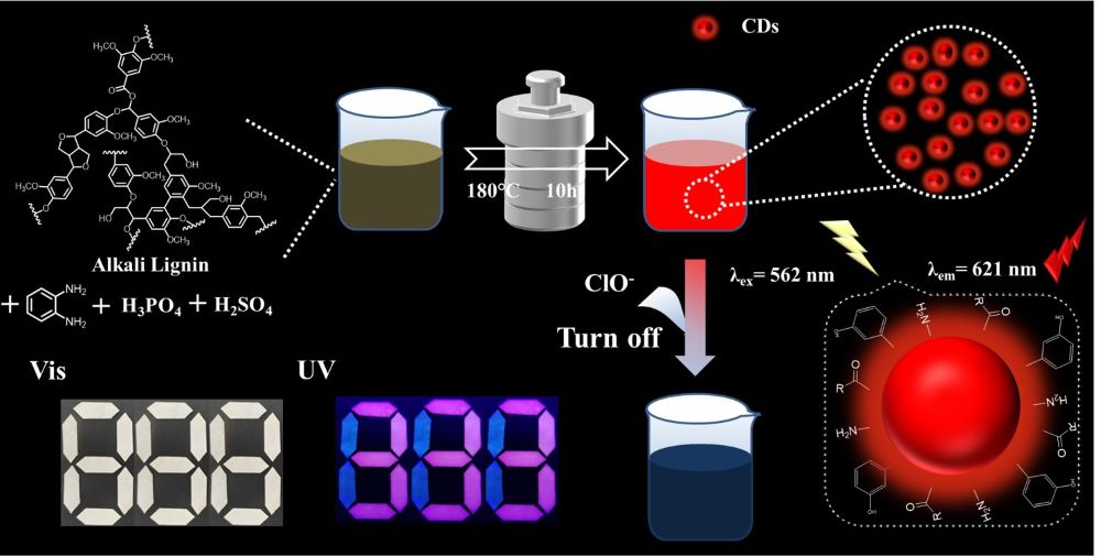 The efficient utilization of natural lignin, which is the main by-product of the cellulose industry, is crucial for enhancing its economic value, alleviating the environmental burden, and improving ecological security. By taking advantage of the large sp2 hybrid domain of lignin and introducing amino functional groups, new lignin-derived carbon dots (SPN-CDs) with red fluorescence were successfully synthesized. Compared with green and blue fluorescent materials, red SPN-CDs have desirable anti-interference properties of short-wave background and exhibit superior luminescence stability. The SPN-CDs obtained exhibited sensitive and distinctive visible color with fluorescence-dual responses toward hypochlorite. Considering this feature, a portable, low-cost, and sensitive fluorescence sensing paper with a low limit of detection of 0.249 μmol∙L–1 was fabricated using the SPN-CDs for hypochlorite detection. Furthermore, a new type of visible-light and fluorescence dual-channel information encryption platform was constructed. Low-concentration hypochlorite can be employed as an accessible and efficient information encryption/decryption stimulus, as well as an information “eraser”, facilitating a safe and diversified transmission and convenient decryption of information. This work opens new avenues for high-value-added applications of lignin-based fluorescent materials.