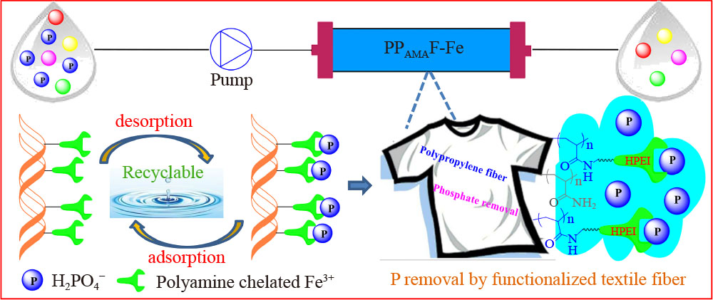 Herein, a Fe3+-loaded aminated polypropylene fiber has been reported as an efficient phosphate adsorbent. The remarkable phosphate removal ability of the fiber is due to Fe3+ immobilization, and it demonstrates a maximum adsorption capacity of 33.94 mg·P·g–1. Adsorption experiments showed that the fiber is applicable over a wide pH range from 2 to 9. Furthermore, the adsorption kinetics and isotherm data were consistent with the pseudo-second-order and Langmuir adsorption models, respectively. The adsorption equilibrium of the fiber for phosphate was reached within 60 min, indicating an efficient monolayer chemisorption process. Moreover, the adsorbent maintained prominent phosphate removal in the presence of competitive ions such as NO3– and Cl–, exhibiting high selectivity. More importantly, the fiber demonstrated excellent reusability (5 times) and low adsorption limit below 0.02 mg·P·g–1. In addition, the phosphate removal efficiency of the fiber can exceed 99% under continuous flow conditions. The adsorption mechanism was studied by X-ray photoelectron spectroscopy, showing that the adsorption of phosphate on the fiber mainly depended on the chemical adsorption of the modified Fe3+. Overall, this study proves that the fiber possesses many advantages for phosphate removal, including high adsorption efficiency, lower treatment limit, good recyclability, and environmental friendliness.