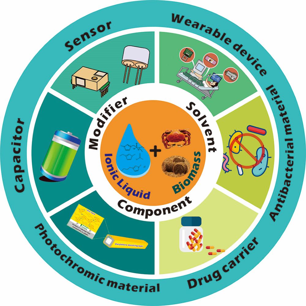 The utilization of sustainable resources provides a path to relieving the problem of dependence on fossil resources. In this context, biomass materials have become a feasible substitute for petroleum-based materials. The development of biomass materials is booming and advanced biomass materials with various functional properties are used in many fields including medicine, electrochemistry, and environmental science. In recent years, ionic liquids have been widely used in biomass pretreatments and processing owing to their “green” characteristics and adjustable physicochemical properties. Thus, the effects of ionic liquids in biomass materials generation require further study. This review summarizes the multiple roles of ionic liquids in promoting the synthesis and application of advanced biomass materials as solvents, structural components, and modifiers. Finally, a prospective approach is proposed for producing additional higher-quality possibilities between ionic liquids and advanced biomass materials.