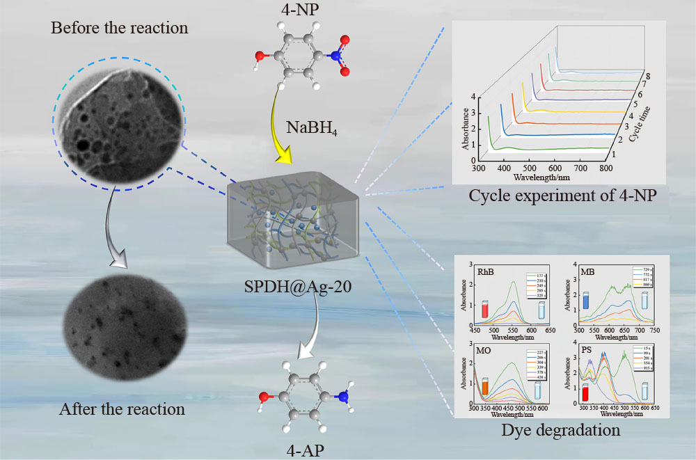 A novel alginate/poly(acrylic acid/acrylamide) double-network hydrogel composite with silver nanoparticles was successfully fabricated using the sol–gel method. The presence of carboxyl and amide groups in the network structure provided abundant active sites for complexing silver ions, facilitating the in situ reduction and confinement of silver nanoparticles. In batch experiments, the optimal silver loading was 20%, and 5 mmol·L–1 of p-nitrophenol was completely degraded in 113 s with a rate constant value of 4.057 × 10−2 s–1. In the tap water system and simulated seawater system, the degradation time of p-nitrophenol at the same concentration was 261 and 276 s, respectively, with a conversion rate above 99%. In the fixed-bed experiment, the conversion rate remained above 74% after 3 h at a flowing rate of 7 mL·min–1. After 8 cycling tests, the conversion rate remained at 98.7%. Moreover, the catalyst exhibited outstanding performance in the degradation experiment of four typical organic dyes.