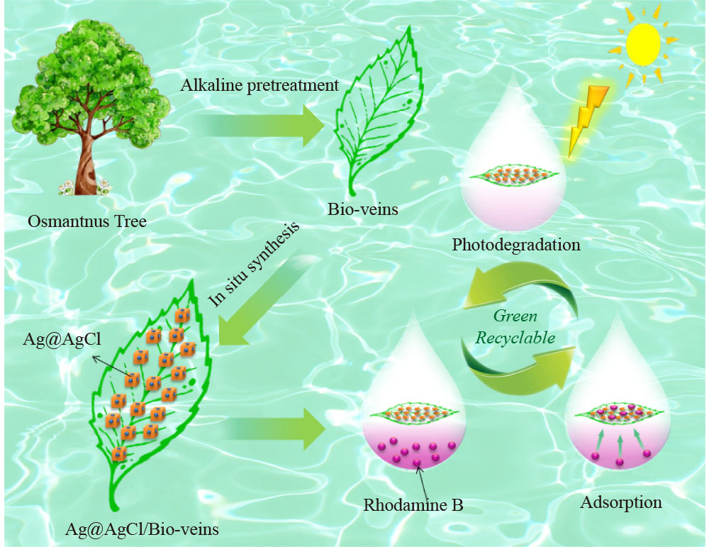 The industrial application of nano-photocatalysts in wastewater treatment has been severely restricted for a long time due to their difficult separation, poor reusability, and low efficiency. In this work, a facile strategy was proposed to enhance the photocatalytic activity and recovery performance of Ag@AgCl nanocatalysts. Biological veins (Bio-veins) with a unique 3D porous construction were used as carriers for the in-situ growth of Ag@AgCl nanoparticles. Scanning electron microscopy results showed that the Ag@AgCl nanoparticles were uniformly loaded on the surface and interior of the Bio-veins, and the size of the Ag@AgCl nanoparticles immobilized on the Bio-veins (50–300 nm) was significantly smaller than Ag@AgCl obtained by the co-precipitation method (1–3 μm). The Bio-veins played a vital role in the photocatalysis reaction system. The degradation efficiency of the Ag@AgCl/Bio-veins(CI4) was up to 3.50 times as high as pure Ag@AgCl. Furthermore, the composites also exhibited excellent recyclability and stability under both visible and solar light. This work provided a suitable strategy for nano-photocatalysts for practical application and may also offer new possibilities for the high-value utilization of biomass materials.