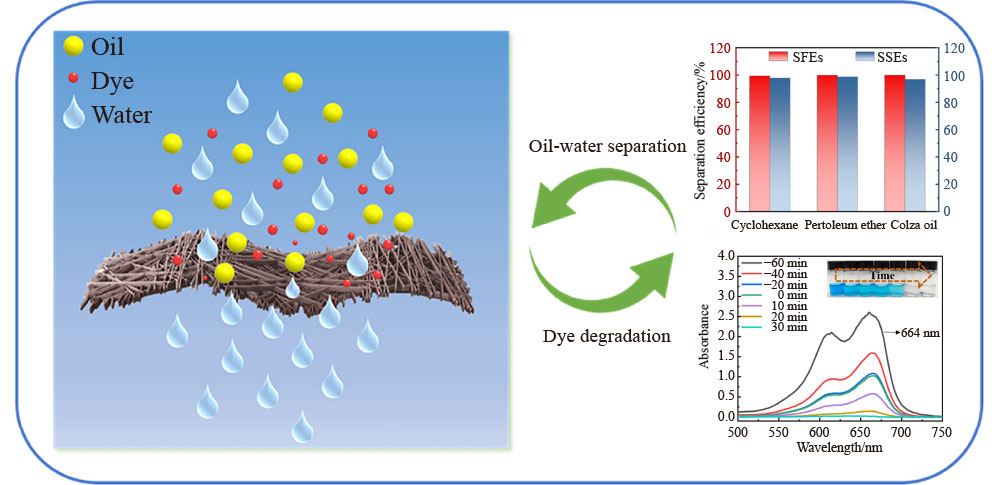 A multi-functional porous paper-based material was prepared from grass pulp by simple pore-forming and green cross-linking method. As a pore-forming agent, calcium citrate increased the porosity of the paper-based material from 30% to 69% while retaining the mechanical strength. The covalent cross-linking of citric acid between cellulose fibers improved both the wet strength and adsorption capacity. In addition, owing to the introduction of high-content carboxyl groups as well as the construction of hierarchical micro-nano structure, the underwater oil contact angle was up to 165°. The separation efficiency of the emulsified oil was 99.3%, and the water flux was up to 2020 L·m–2·h–1. The theoretical maximum adsorption capacities of cadmium ion, lead ion and methylene blue reached 136, 229 and 128.9 mg·g–1, respectively. The continuous purification of complex wastewater can be achieved by using paper-based materials combined with filtration technology. This work provides a simple, low cost and environmental approach for the treatment of complex wastewater containing insoluble oil, organic dyes, and heavy metal ions.
