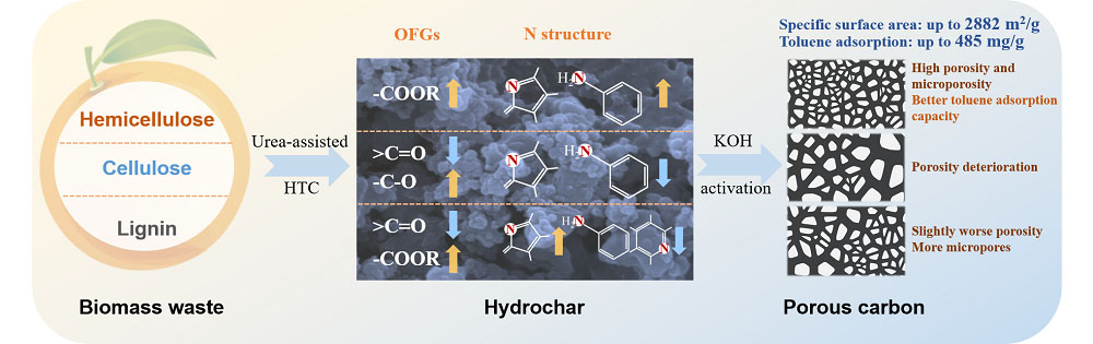 Volatile organic compounds have posed a serious threat to the environment and human health, which require urgent and effective removal. In recent years, the preparation of porous carbon from biomass waste for volatile organic compounds adsorption has attracted increasing attention as a very cost-effective and promising technology. In this study, porous carbon was synthesized from orange peel by urea-assisted hydrothermal carbonization and KOH activation. The role of typical components (cellulose, hemicellulose, and lignin) in pore development and volatile organic compounds adsorption was investigated. Among the three components, hemicellulose was the major contributor to high porosity and abundant micropores in porous carbon. Higher hemicellulose content led to more abundant –COOR, amine-N, and pyrrolic/pyridonic-N in the derived hydrochar, which were favorable for porosity formation during activation. In this case, the toluene adsorption capacity of the porous carbon improved from 382.8 to 485.3 mg·g–1. Unlike hemicellulose, cellulose reduced the >C=O, amine-N, and pyrrolic/pyridonic-N content of the hydrochar, which caused porosity deterioration and worse toluene adsorption performance. Lignin bestowed the hydrochar with slightly increased –COOR, pyrrolic/pyridonic-N, and graphitic-N, and reduced >C=O, resulting in comparatively poor porosity and more abundant micropores. In general, the obtained porous carbon possessed abundant micropores and high specific surface area, with the highest up to 2882 m2·g–1. This study can provide guidance for selecting suitable biomass waste to synthesize porous carbon with better porosity for efficient volatile organic compounds adsorption.