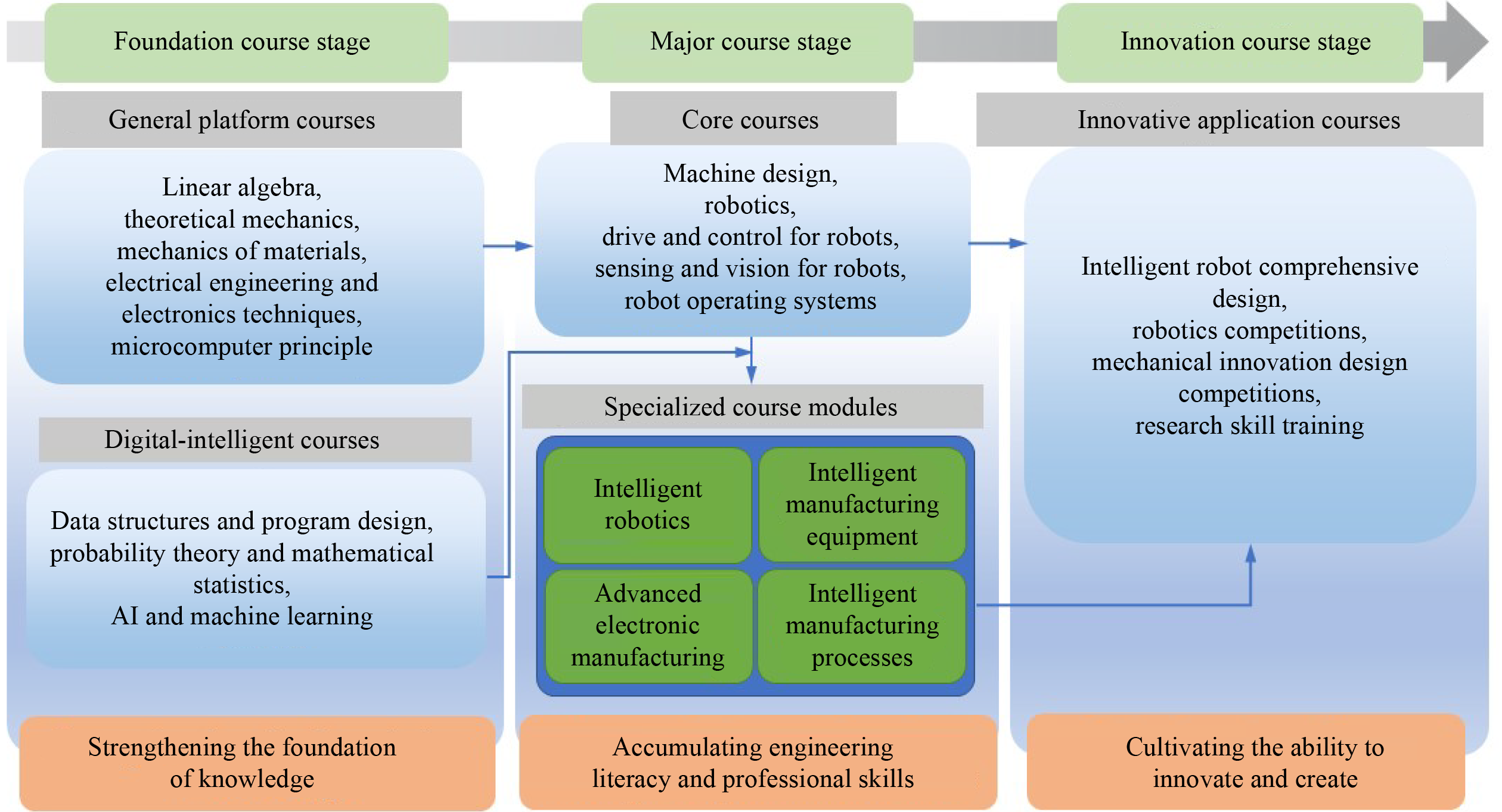 Cultivating talents in robotics requires the integration of multiple disciplines, including mechanical engineering, electronics, computer science, and control engineering. The rapid expansion of the robotics industry in recent years has highlighted a significant talent gap and compelled universities to raise the standards of talent development in this field. This research examines the distinctive features of talent cultivation in robotics, draws on the practices of Wuhan University’s intelligent robotics program, and incorporates the concept of digital-intelligent education to propose an innovative talent cultivation framework termed system reconstruction and a fourfold integration education. This research emphasizes the importance of digital-intelligent interdisciplinarity and reports on the establishment of a progressive and comprehensive professional curriculum system. It also presents a supporting model that includes research-activated education, industry-driven education, competition-enhanced education, and interdisciplinary education, thereby creating a project-driven innovation practice platform and talent cultivation mechanism. Guided by systematic reconstruction and fourfold integration education mechanism, the digital-intelligent interdisciplinary curriculum and project-driven practice platform have significantly improved students’ professional knowledge, innovative ability, and sense of social responsibility. This mechanism has not only improved the quality of talent cultivation in intelligent robotics but has also increased the impact of academic competitions and garnered widespread acclaim from peers.