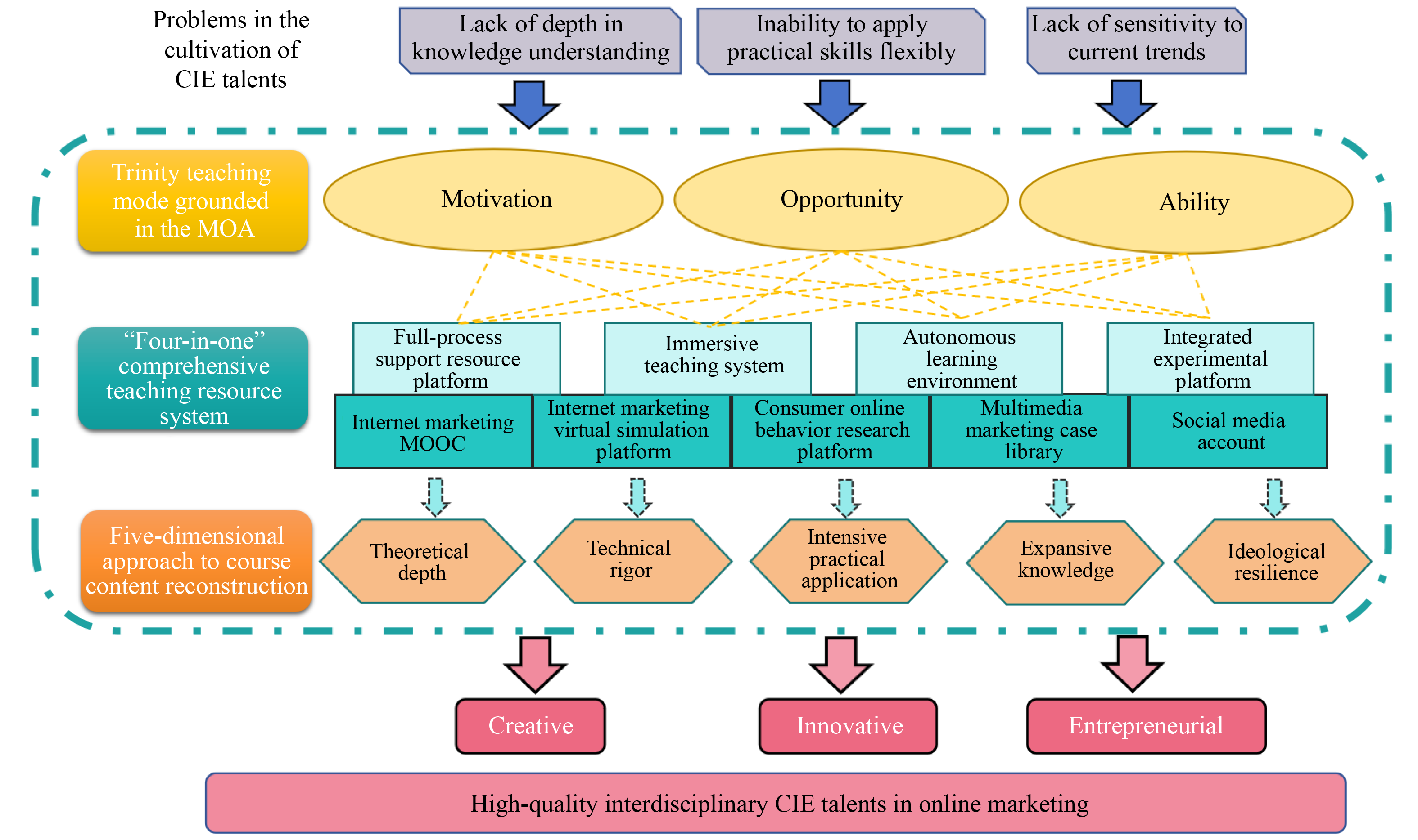 In the era of the digital economy, the Internet marketing course, a core component of the marketing curriculum in higher education, has become increasingly critical. However, the traditional teaching practices of the course have faced challenges, including insufficient depth in theoretical understanding, limited flexibility in translating theory into practice, inadequate alignment with contemporary trends, and a lack of adaptability to rapidly evolving environments. To address these issues, the teaching team at Wuhan University redesigned the course across five dimensions, including depth, rigor, intensity, breadth, and resilience. Leveraging a “four-in-one” teaching resource system, the course adopted an innovative teaching methodology grounded in the motivation, opportunity, and ability (MOA) framework. This method stimulated students’ intrinsic learning motivation, fostered collaborative creativity, and promoted mutual growth. It empowers students to develop self-management capabilities and establishes a student-centered learning paradigm characterized by shared responsibility, co-creation, and collective ownership. The teaching model ultimately seeks to cultivate high-quality and interdisciplinary talents in online marketing who are equipped with the entrepreneurial, innovative, and creative competencies necessary to meet the demands of the digital economy.