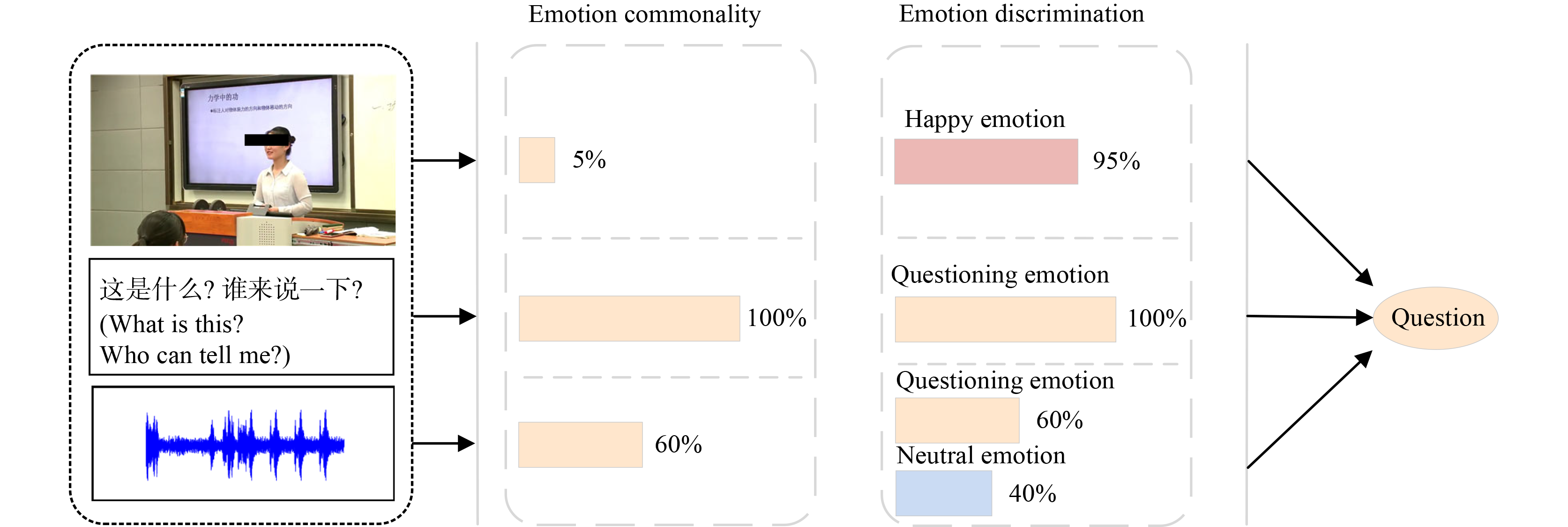 Teacher emotion recognition (TER) has a significant impact on student engagement, classroom atmosphere, and teaching quality, which is a research hotspot in the smart education area. However, existing studies lack high-quality multimodal datasets and neglect common and discriminative features of multimodal data in emotion expression. To address these challenges, this research constructs a multimodal TER dataset suitable for real classroom teaching scenarios. TER dataset contains a total of 102 lessons and 2,170 video segments from multiple educational stages and subjects, innovatively labelled with emotional tags that characterize teacher‒student interactions, such as satisfaction and questions. To explore the characteristics of multimodal data in emotion expression, this research proposes an emotion dual-space network (EDSN) that establishes an emotion commonality space construction (ECSC) module and an emotion discrimination space construction (EDSC) module. Specifically, the EDSN utilizes central moment differences to measure the similarity to assess the correlation between multiple modalities within the emotion commonality space. On this basis, the gradient reversal layer and orthogonal projection are further utilized to construct the EDSC to extract unique emotional information and remove redundant information from each modality. Experimental results demonstrate that the EDSN achieves an accuracy of 0.770 and a weighted F1 score of 0.769 on the TER dataset, outperforming other comparative models.