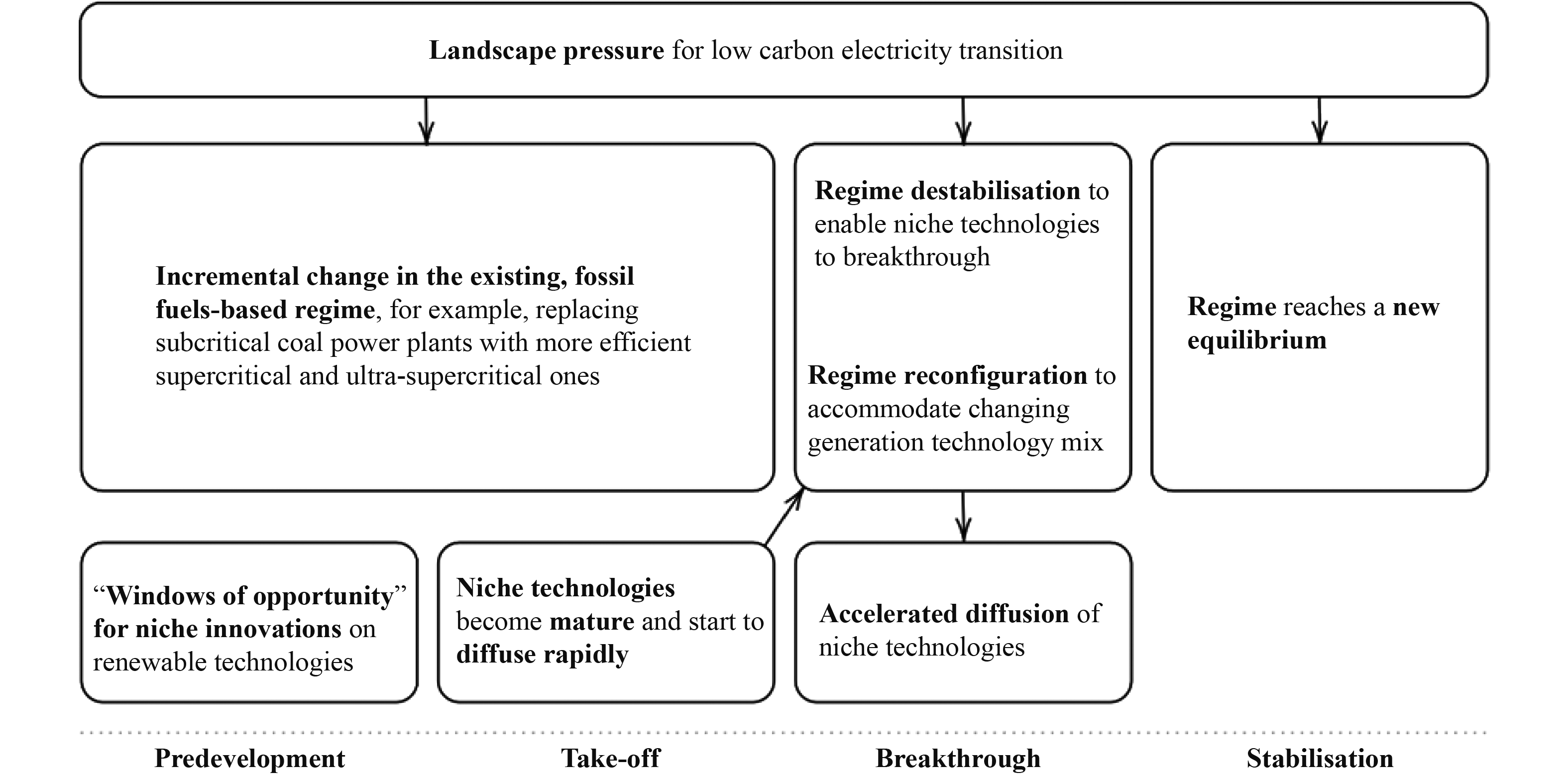 This study extends the ambit of the debate on electricity transition by specifically identifying possible policy entry points through which transformative and enduring changes can be made in the electricity and socio–economic systems to facilitate the transition process. Guided by the “essence” of the multi-level perspective — a prominent framework for the study of energy transition, four such entry points have been identified: 1) destabilising the dominant, fossil fuel-based electricity regime to create room for renewable technologies to break through; 2) reconfiguring the electricity regime, which encompasses technology, short-term operational practices and long-term planning processes, to improve flexibility for accommodating large outputs from variable renewable sources whilst maintaining supply security; 3) addressing the impact of coal power phase-out on coal mining regions in terms of economic development and jobs; and 4) facilitating a shift in transition governance towards a learning-based, reflexive process. Specific areas for policy interventions within each of these entry points have also been discussed in the paper.