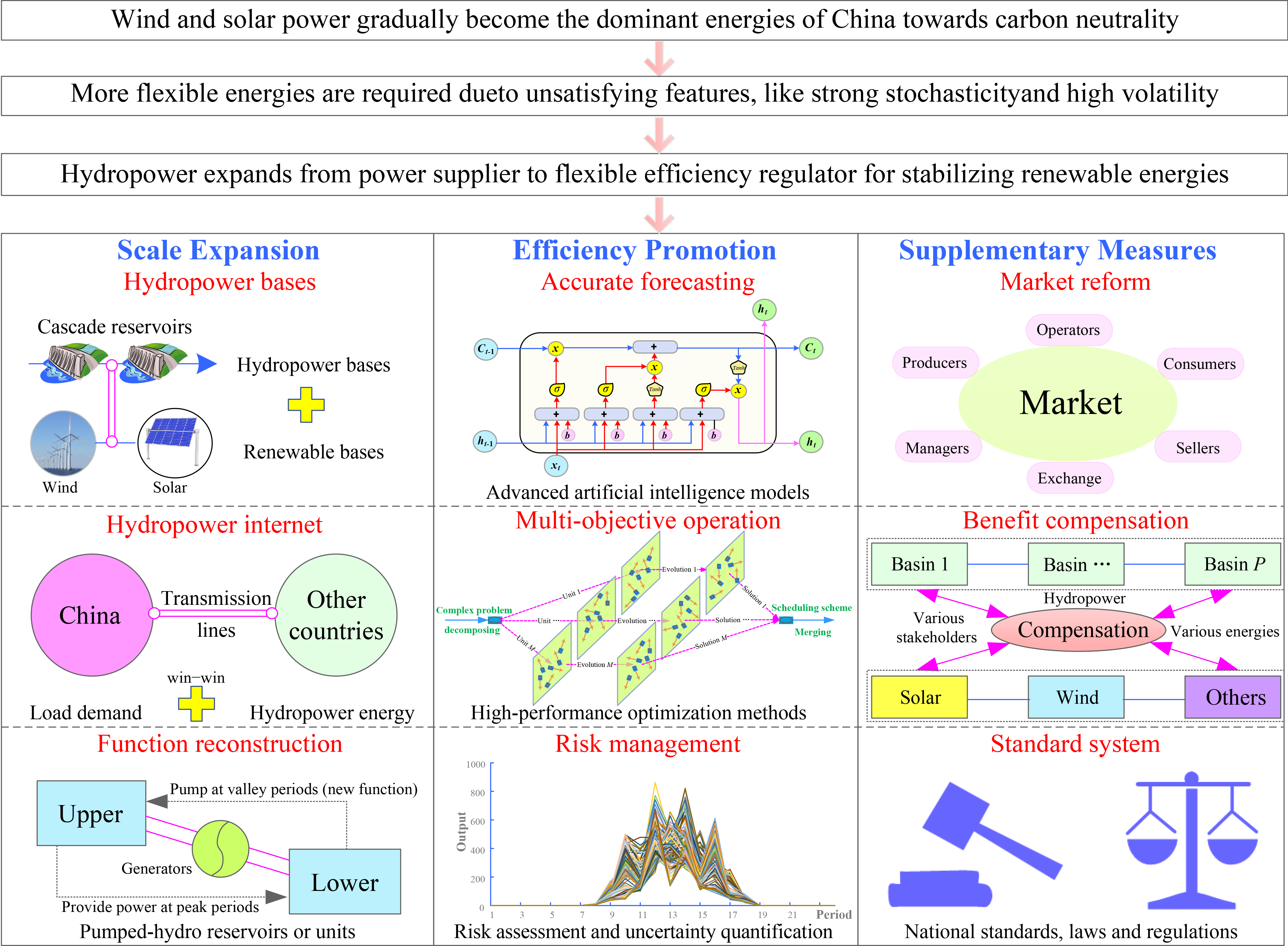 Wind and solar powers will gradually become dominant energies toward carbon neutrality. Large-scale renewable energies, with strong stochasticity, high volatility, and unadjustable features, have great impacts on the safe operation of power system. Thus, an advanced hydropower energy system serving multiple energies is required to respond to volatility, with expanding role from a “stable energy supplier” to a “flexible efficiency regulator”. Future research and application can be considered from three aspects: 1) system expansion (e.g., the construction of large-scale hydropower/renewable energy bases in China, the construction of transnational hydropower energy internet, and the functional transformation of traditional hydropower reservoirs and generating units); 2) efficiency promotion (e.g., advanced intelligent forecasting, multi-objective operation, and risk management methods); and 3) supporting measures (e.g., market reform, benefit compensation and policy mechanism, technical standards, and laws and regulations).
