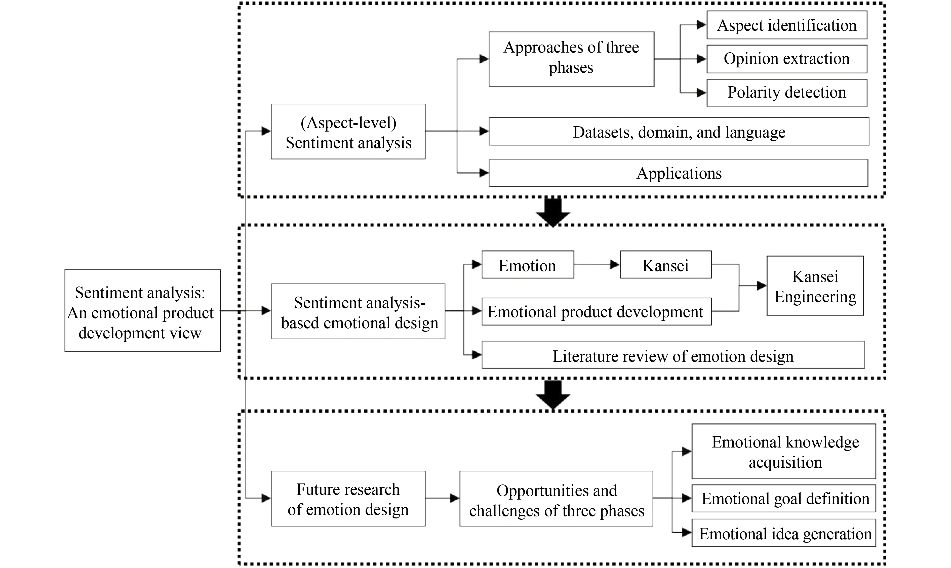 Conveying consumers’ specific emotions in new products, referred to as emotional product development or emotional design, is strategically crucial for manufacturers. Given that sentiment analysis (SA) can extract and analyze people’s opinions, sentiments, attitudes, and perceptions regarding different products/services, SA-based emotional design may provide manufacturers with real-time, direct, and rapid decision support. Despite its considerable advancements and numerous survey and review articles, SA is seldom considered in emotional design. This study is among the first efforts to conduct a thorough review of SA from the view of emotional design. The comprehensive review of aspect-level SA reveals the following: 1) All studies focus on extracting product features by mixing technical product features and consumers’ emotional perceptions. Consequently, such studies cannot capture the relationships between technical and emotional attributes and thus cannot convey specific emotions to the new products. 2) Most studies use the English language in SA, but other languages have recently received more interest in SA. Furthermore, after conceptualizing emotion as Kansei and introducing emotional product development and Kansei Engineering, a review of the data-driven emotional design is then conducted. A few efforts start to study emotional design with the help of SA. However, these studies only focus on either analyzing consumers’ preferences on product features or extracting emotional opinions from online reviews, thus cannot realize data-driven emotional product development. Finally, some research opportunities are provided. This study opens a broad door to aspect-level SA and its integration with emotional product development.