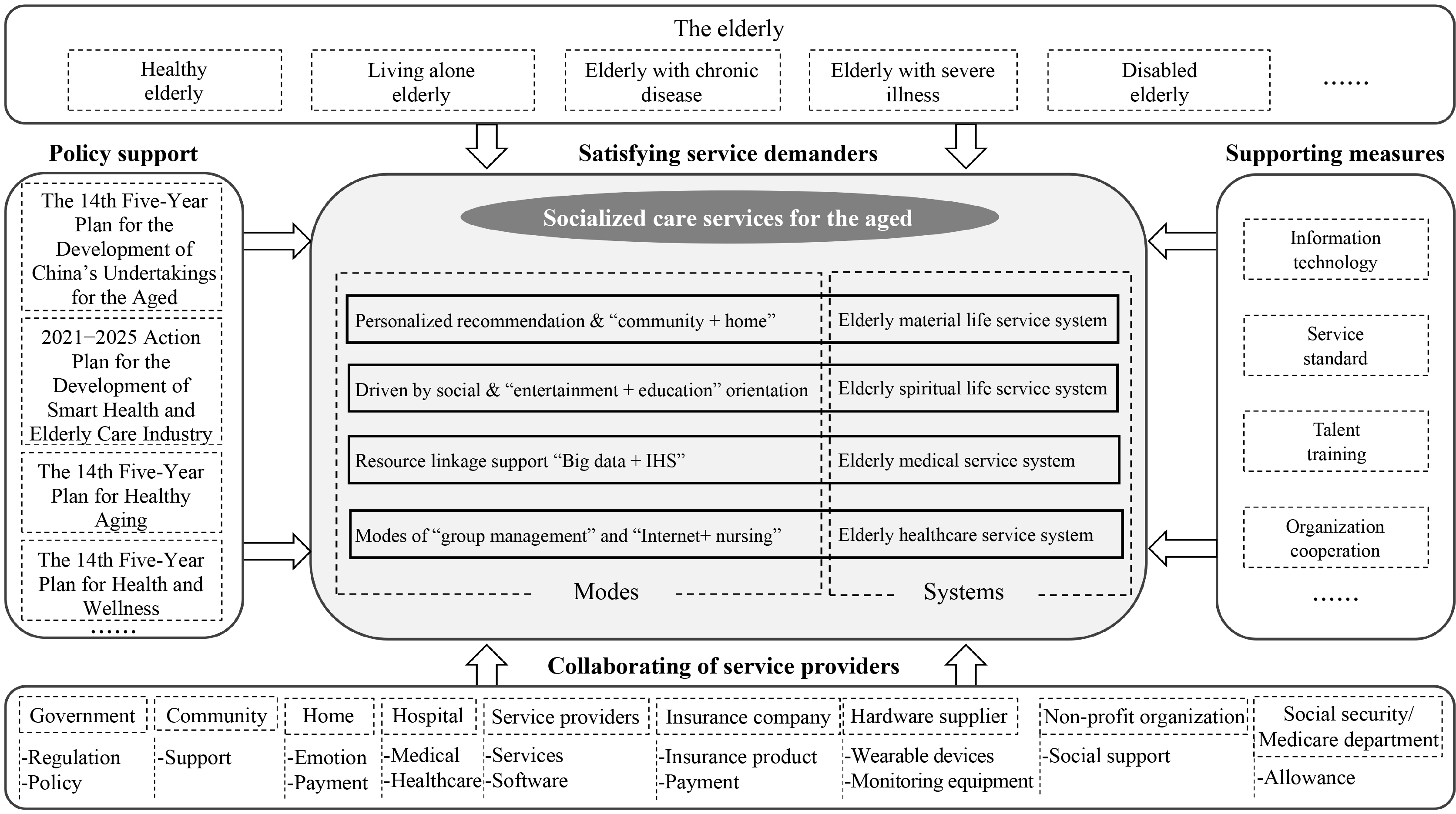 Given the aging society, an increase in social demand, information- and communication technology-driven culture, and government policy support emerges to enable the development of the socialized care services system for the aged (SCSSA). The development of the SCSSA would be a significant step toward addressing China’s aging population. However, the construction of the SCSSA challenges the theories and methods of traditional elderly care service system construction. Specifically, the implementation path for such elderly care service policies is unclear, the necessary technological support is insufficient, and the mechanism for integrating intelligent information technology remains underexplored. Thus, this paper focuses on the needs of the elderly, grounded in the context of the changing elderly care service policies in China, and proposes a research paradigm that integrates system construction and support measure embedding. We then construct the original SCSSA, which includes “material + spirit + medical treatment + healthcare” and propose a method of optimization and iteration. Finally, we build the research framework of systematic support measures from the perspectives of policy reconstruction, institutional embeddedness, and technical support. Our work provides theoretical support and practical guidance for the construction and dynamic optimization of the SCSSA, thus making a significant contribution that will help China effectively cope with its aging society.