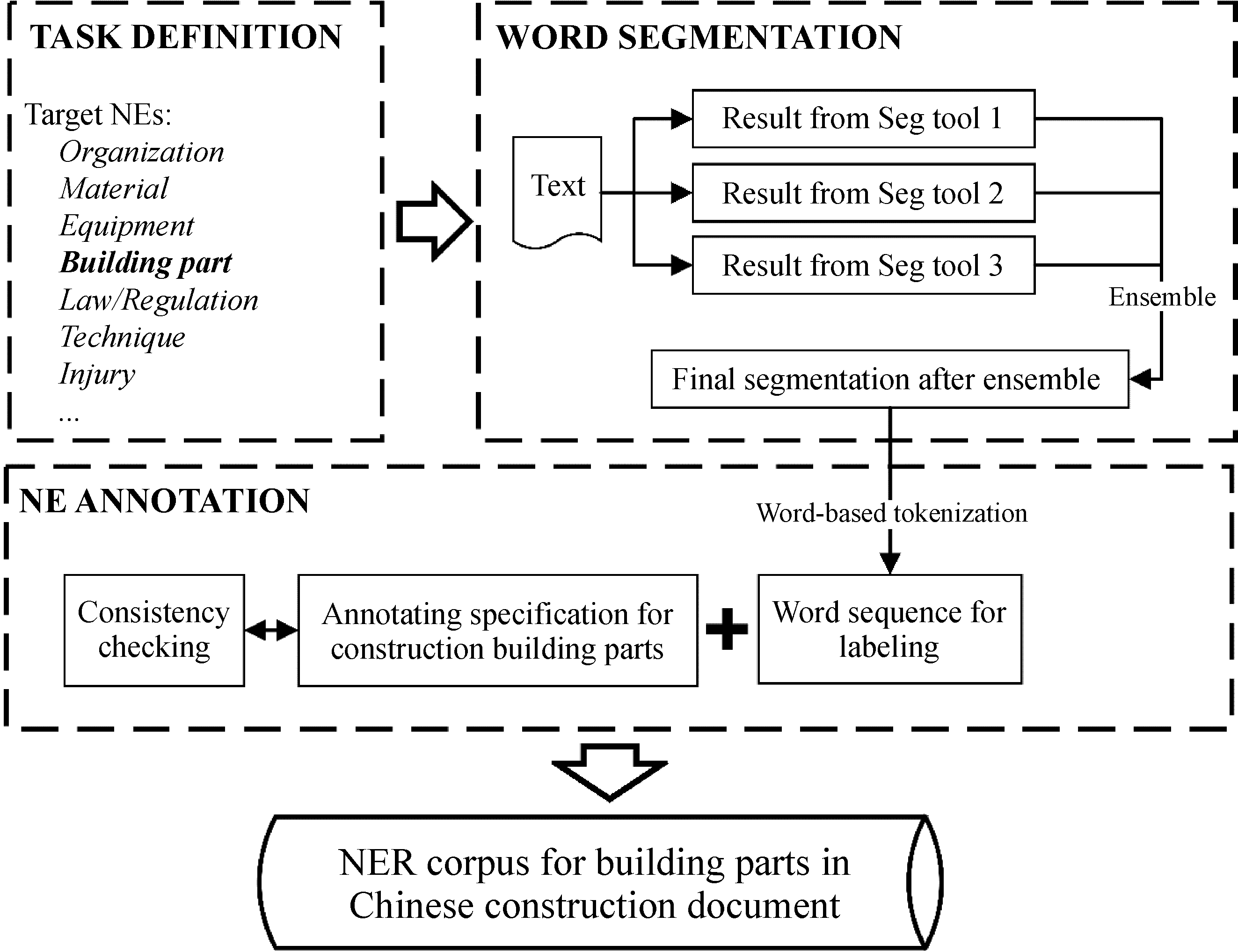Named entity recognition (NER) is essential in many natural language processing (NLP) tasks such as information extraction and document classification. A construction document usually contains critical named entities, and an effective NER method can provide a solid foundation for downstream applications to improve construction management efficiency. This study presents a NER method for Chinese construction documents based on conditional random field (CRF), including a corpus design pipeline and a CRF model. The corpus design pipeline identifies typical NER tasks in construction management, enables word-based tokenization, and controls the annotation consistency with a newly designed annotating specification. The CRF model engineers nine transformation features and seven classes of state features, covering the impacts of word position, part-of-speech (POS), and word/character states within the context. The F1-measure on a labeled construction data set is 87.9%. Furthermore, as more domain knowledge features are infused, the marginal performance improvement of including POS information will decrease, leading to a promising research direction of POS customization to improve NLP performance with limited data.