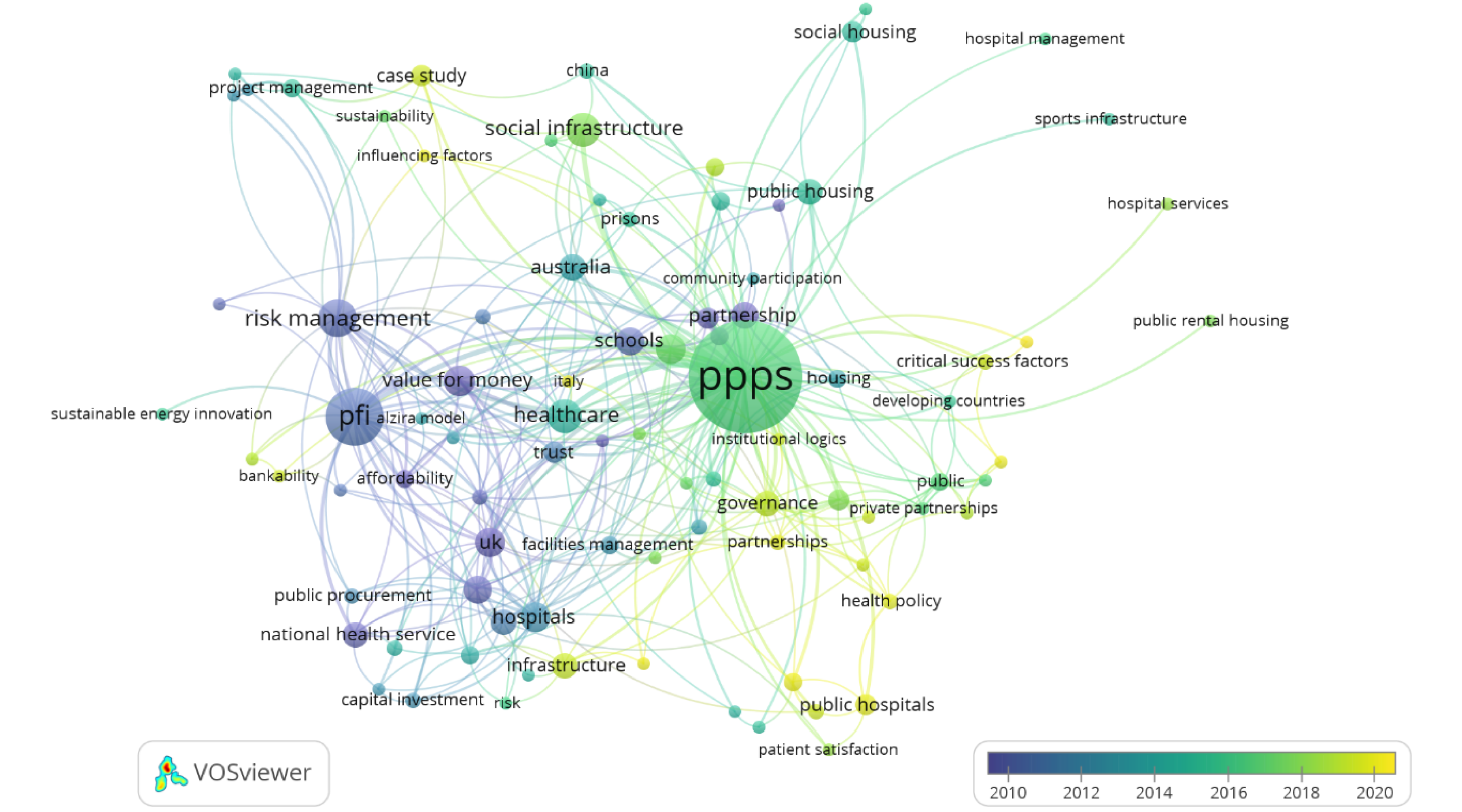 Social infrastructure has become an important element for measuring national economic development and social benefits that are usually financed in the form of government grants, private investment, and public‒private partnerships (PPPs). However, social infrastructure PPPs have attracted considerable public debate due to their low profitability and complex operational demands. This study aims to answer the question, “are PPPs still an answer for social infrastructure?”, from the perspectives of the body of knowledge, application status, and prospects. Initially, an iterative search and review procedure and a scientometric analysis were performed to systematically screen the literature and to structure the body of knowledge of the social infrastructure PPPs literature. Furthermore, the application status and trends were analyzed to further explore the studied countries/regions, application sectors, and research topics. Results show that PPPs still have valuable application potential for delivering social infrastructure despite their mixed results across different topics. Six main research themes and the corresponding research trends were also identified, namely, financing and economics viability, risk management, performance management, contract and relationship management, governance and regulation, and facilitating and hindering factors. These findings offer practitioners and researchers a comprehensive overview and constructive guidance on social infrastructure PPPs.