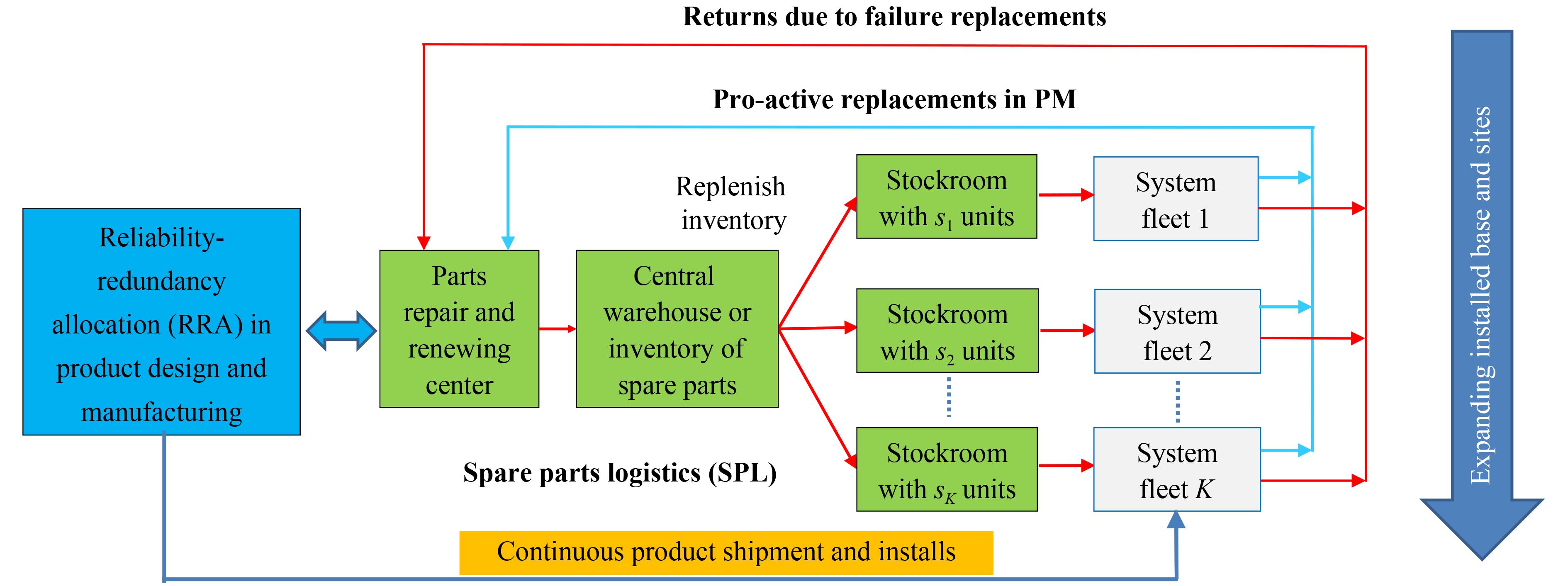 Recently, firms have begun to handle the design, manufacturing, and maintenance of capital goods through a consolidated mechanism called the integrated product-service system. This new paradigm enables firms to deliver high-reliability products while lowering the ownership cost. Hence, holistic optimization models must be proposed for jointly allocating reliability, maintenance, and spare parts inventory across the entire value chain. In the existing literature, these decisions are often made fragmentally, thus resulting in local optimality. This study reviews the extant works pertaining to reliability-redundancy allocation, preventative maintenance, and spare parts logistics models. We discuss the challenges and opportunities of consolidating these decisions under an integrated reliability-maintenance-inventory framework for attaining superior system availability. Specific interest is focused on the new product introduction phase in which firms face a variety of uncertainties, including installed base, usage, reliability, and trade policy. The goal is to call for tackling the integrated reliability-maintenance-inventory allocation model under a nonstationary operating condition. Finally, we place the integrated allocation model in the semiconductor equipment industry and show how the firm deploys reliability initiatives and after-sale support logistics to ensure the fleet uptime for its global customers.