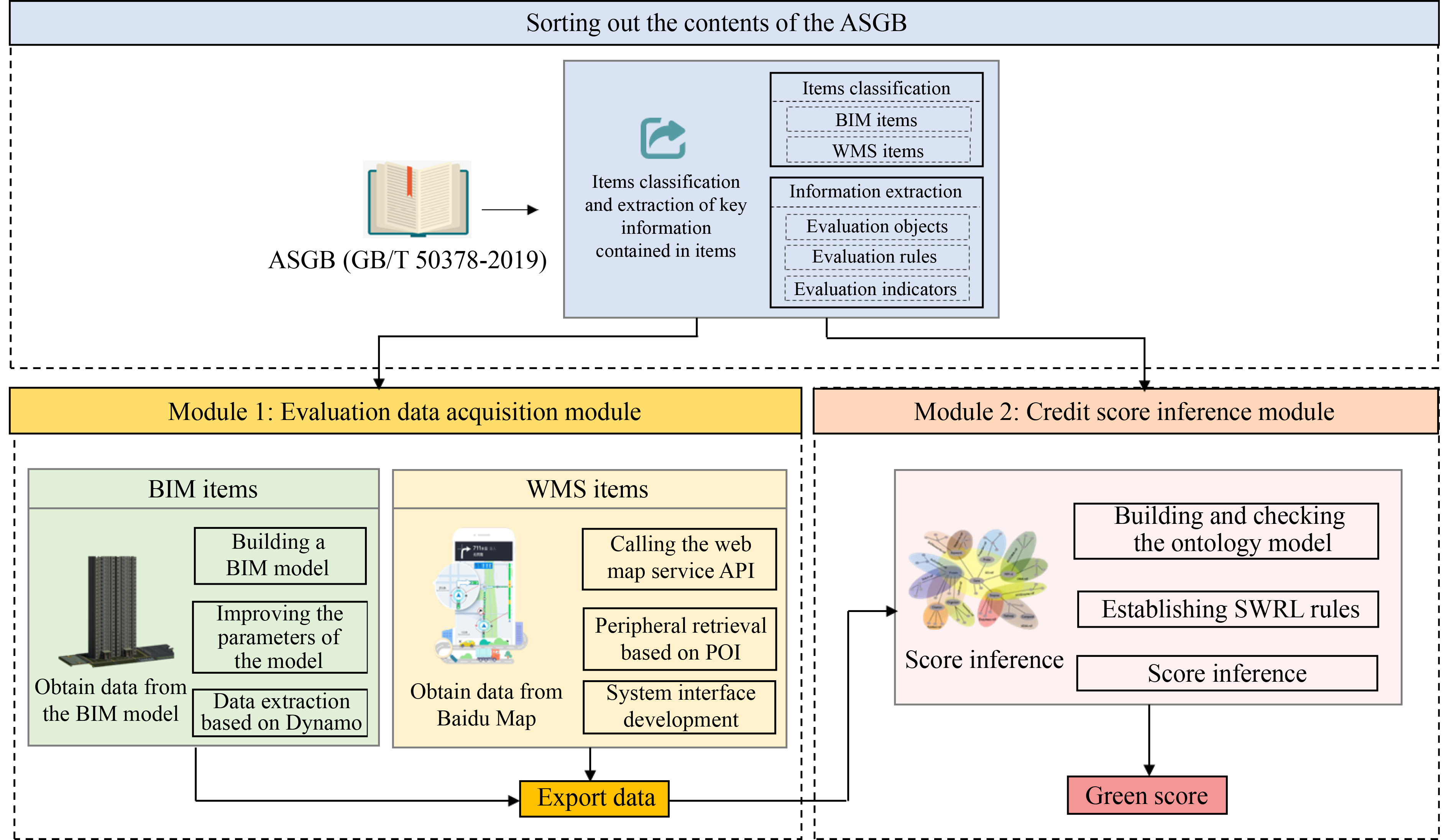 With the burgeoning emphasis on sustainable construction practices in China, the demand for green building assessment has significantly escalated. The overall evaluation process comprises two key components: The acquisition of evaluation data and the evaluation of green scores, both of which entail considerable time and effort. Previous research predominantly concentrated on automating the latter process, often neglecting the exploration of automating the former in accordance with the Chinese green building assessment system. Furthermore, there is a pressing requirement for more streamlined management of structured standard knowledge to facilitate broader dissemination. In response to these challenges, this paper presents a conceptual framework that integrates building information modeling, ontology, and web map services to augment the efficiency of the overall evaluation process and the management of standard knowledge. More specifically, in accordance with the Assessment Standard for Green Building (GB/T 50378-2019) in China, this study innovatively employs visual programming software, Dynamo in Autodesk Revit, and the application programming interface of web map services to expedite the acquisition of essential architectural data and geographic information for green building assessment. Subsequently, ontology technology is harnessed to visualize the management of standard knowledge related to green building assessment and to enable the derivation of green scores through logical reasoning. Ultimately, a residential building is employed as a case study to validate the theoretical and technical feasibility of the developed automated evaluation conceptual framework for green buildings. The research findings hold valuable utility in providing a self-assessment method for applicants in the field.