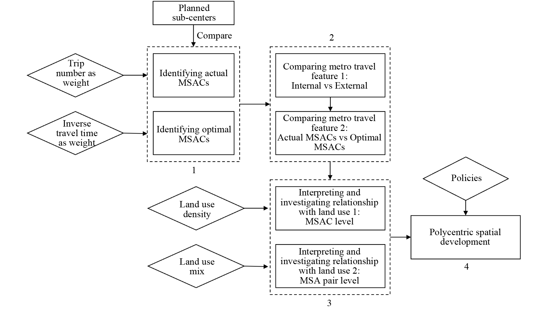 Rail transit plays a crucial role in improving urban sustainability and livability. In many Chinese cities, the planning of rail transit routes and stations is focused on facilitating new developments rather than revitalizing existing built-up areas. This approach reflects the local governments’ expectations of substantial growth to reshape the urban structure. However, existing research on transit-oriented development (TOD) rarely explores the spatial interactions between individual transit stations and investigates how they can be integrated to achieve synergistic effects and balanced development. This study proposes that rail transit systems impact urban structure through two “forces”: the provision of additional and reliable carrying capacity and the reduction of travel time between locations. Metro passenger flow is used as a proxy for these forces, and community detection techniques are employed to identify the actual and optimal spatial clusters in Wuhan, China. The results reveal that the planned sub-centers align reasonably well with the optimal spatial clusters in terms of spatial configuration. However, the actual spatial clusters tend to have longer internal travel times compared to the optimal clusters. Further exploration suggests the need for equalizing land use density within planned spatial clusters served by the metro system. Additionally, promoting concentrated, differentiated, and mixed functional arrangements in metro station areas with low passenger flows within the planned clusters could be beneficial. This paper presents a new framework for investigating urban spatial clusters influenced by a metro system.