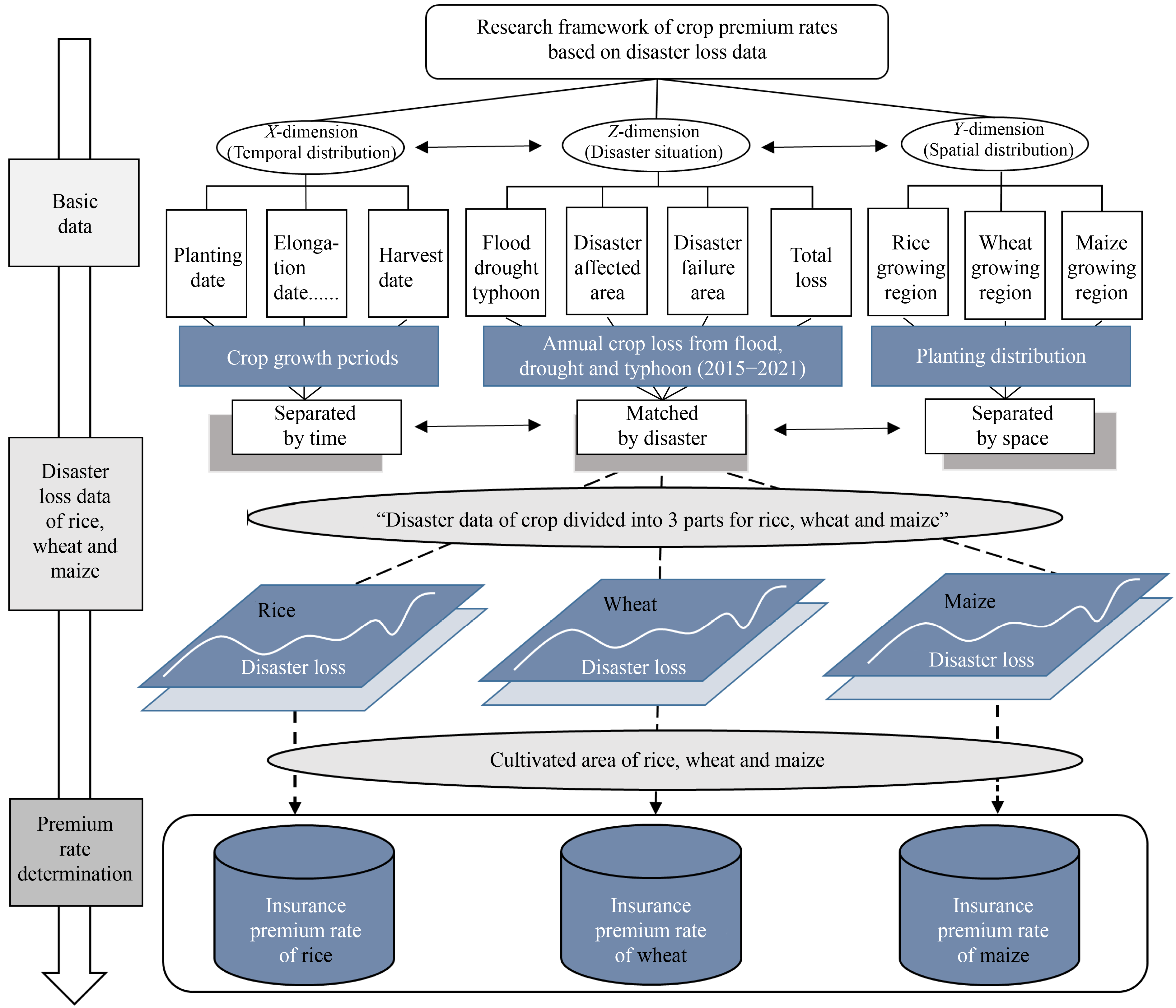 In this study, based on county level disaster data, we established a 3-D matching temporal (X) - spatial (Y) - disaster loss (Z) analysis method. The aim of this study was to explore the extent of disaster losses in the primary rice, wheat, and maize producing regions nationwide and to delineate regional disparities in agricultural premium insurance rates. Through this approach, the precision of agricultural insurance rates was significantly enhanced, providing valuable insights for the implementation of regional differential rates across China. Our method demonstrated significance for further improvement of the framework and model of crop disaster risk management and disaster prevention and reduction work.