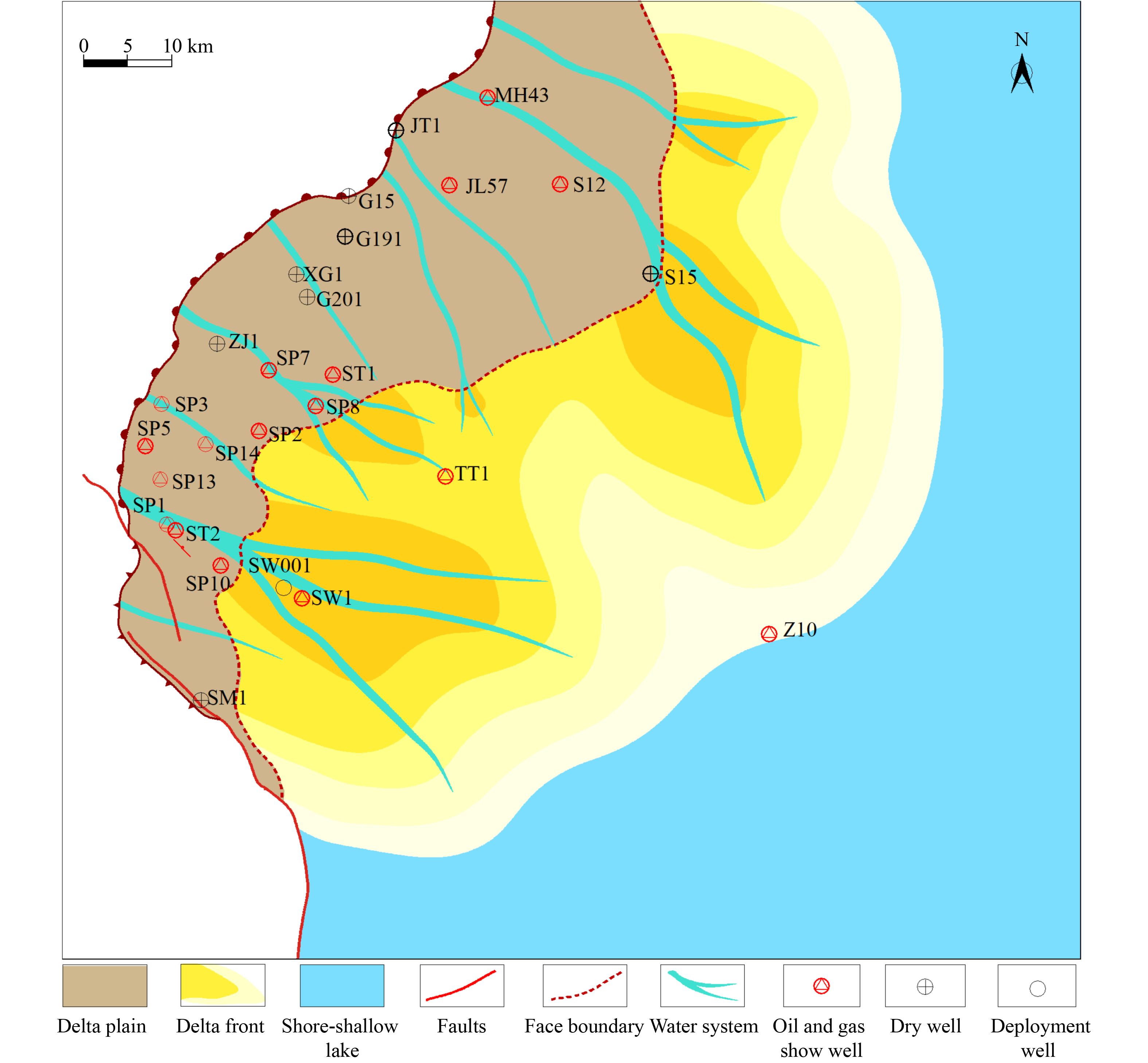 The slope of the Shawan Depression is a gently monoclinic structure, dipping south-eastward, with regional development of platform, anticlinal, or nose-like structures. The Shawan Depression is one of the main oil-generating depressions in the Junggar Basin, with abundant oil and gas sources. The Triassic Baikouquan Formation in the Shawan slope has a fan-delta sedimentary environment, where sedimentary facies change rapidly. The fan-delta plain is developed in the north-west and gradually transitions southward to the fan-delta front. The lithologic structure is complex, and lateral changes are significant. The main lithology is low-porosity and low-permeability conglomerate. However, in the underwater distributary channels of the delta front, well-sorted gray-green conglomerate with medium-high porosity develops, which is the dominant reservoir in the Well SW1 area (Fig.1). Well ST2, located in the delta plain facies, is filled with dense conglomerate, while Well SW1, located in the fan-delta front facies, has two sets of high-porosity oil-water co-existent layers with thicknesses of only 7 m and 12 m. Therefore, in the updip direction of SW1, Well SW001 is planned to explore for pure oil layers.