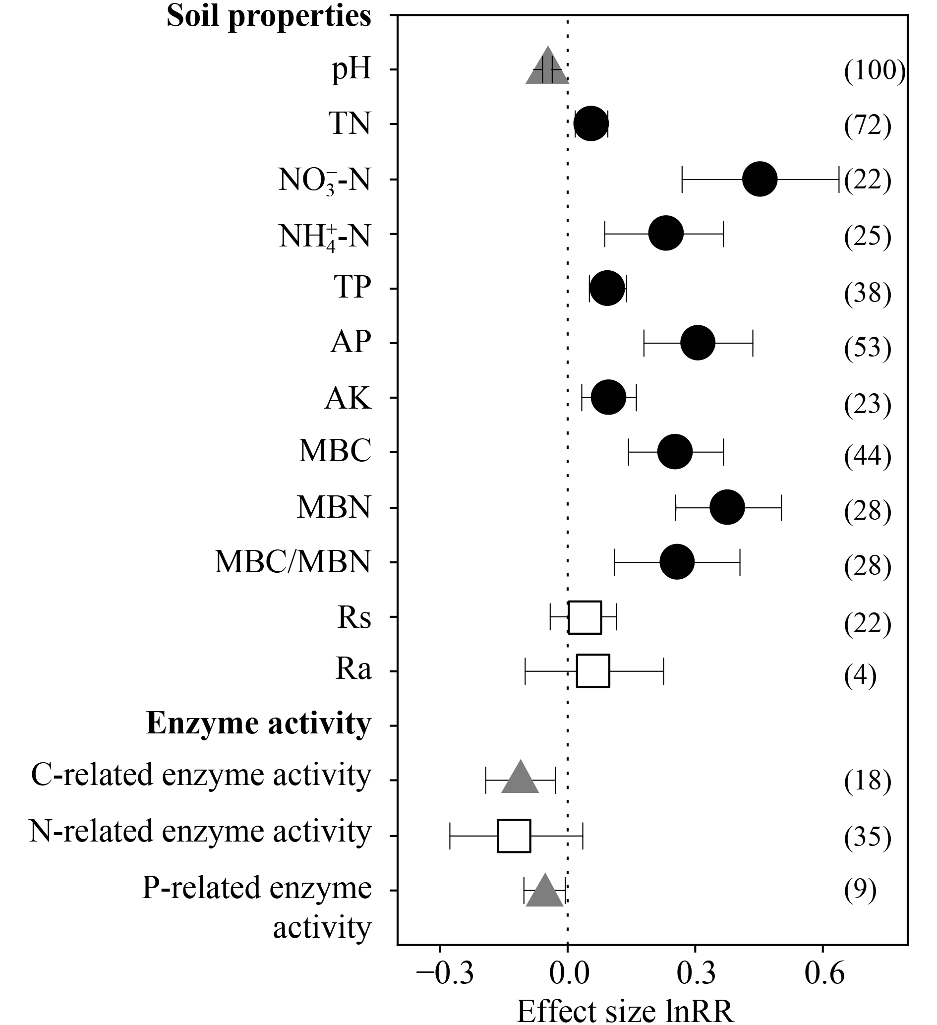 In bamboo forests, fertilization significantly increased soil TN, NO3--N, NH4+-N, TP, AP, AK, MBC, MBN, and MBC/MBN (by 5.78%, 57.43%, 25.55%, 9.97%, 35.95%, 10.20%, 29.91%, 46.11%, and 29.45%, respectively, mean lnRR = 0.06, 0.45, 0.23, 0.10, 0.31, 0.10, 0.25, 0.38, and 0.26, respectively (all p < 0.05, Fig.1). Fertilization also decreased soil pH by 4.62% (mean lnRR: −0.05, p < 0.001). However, fertilization had non-significant impacts on Rs and Ra (all p < 0.05, Fig.1). Additionally, fertilization decreased C- and P-related enzyme activities by 10.47% and 5.23%, respectively (mean lnRR: −0.11 and −0.05, all p < 0.05, Fig.1), while showing non-significant impacts on N-related enzyme activity.