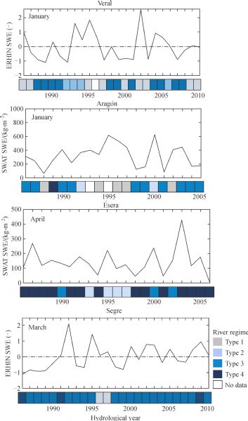 The purpose of this study was to characterize mountain river regimes in the Spanish Pyrenees and to assess the importance of snow accumulation and snowmelt on the timing of river flows. Daily streamflow data from 9 gauging stations in the Pyrenees were used to characterize river regimes. These data were analyzed by hydrological indices, with a focus on periods when snow accumulation and snowmelt occurred. These results were combined with data on Snow Water Equivalent (SWE) (from measurements of depth and density of snow in the main river basins and also simulated by a process-based hydrological model), snowmelting (simulated by a process-based hydrological model), precipitation (from observations), and temperature (from observations). Longitude and elevation gradients in the Pyrenees explain the transition of river regimes from those that mostly had low nival signals (in the west and at low elevations) to those that mostly had high nival signals (low winter runoff and late spring peakflow, in the east and at high elevations). Although trend analyses indicated no statistically significant changes, there was a trend of decreased nival signal over time in most of the analyzed rivers. Our results also demonstrated that snow processes cannot explain all of the interannual variability of river regimes, because the temporal distribution of liquid precipitation and temperature play key roles in hydrography.