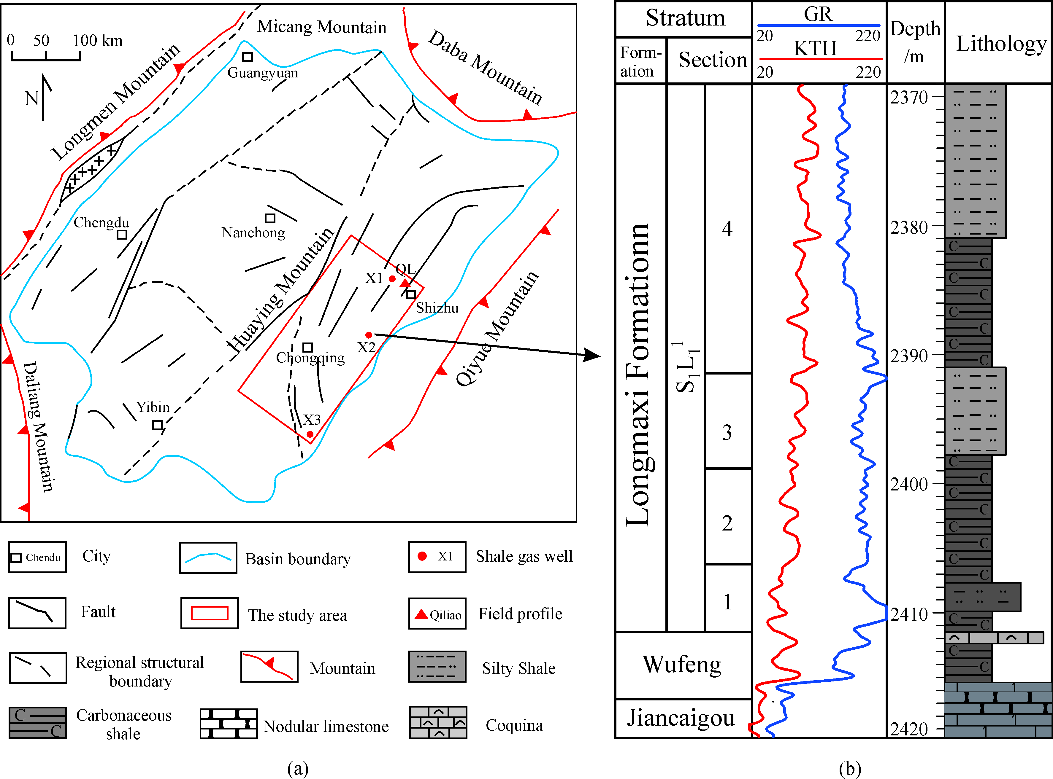 The lower Cambrian Niutitang Formation is of crucial importance for shale gas target reservoirs in western Hubei, China; however, little work has been done in this field, and its shale gas accumulation and enrichment mechanism are still unclear. Based on survey wells, outcrop data, and large numbers of tests, the geological conditions of shale gas accumulation were studied; moreover, the factors that influence the gas content were thoroughly discussed. The results show that the Niutitang Formation (1n) can be divided into three sections: the first section (1n1), the second section (1n2), and the third section (1n3). The 1n2 is the main shale gas reservoir. The deep shelf facies is the main sedimentary facies and can be divided into three main lithofacies: argillaceous siltstone, carbonaceous shale and carbonaceous siliceous rock. The total organic carbon (TOC) content shows gentle growth trends until bottom of the 1n2 and then decreases rapidly within the 1n1, and the TOC content mainly ranges from 2% to 4% horizontally. The calcite and dolomite dissolution pores, clay intergranular pores and organic pores are the main pore types and the micropore types are clearly related to the mineral compositions and the TOC content. Vertically, the gas content is mainly affected by the TOC content. Horizontally, wells with high gas contents are distributed only southeast of the Huangling anticline, and the combination of structural styles, fault and fracture development, and the distribution of the regional unconformity boundary between the upper Sinian Dengying Formation (Z2d) and the 1n2 are the three most important factors affecting the gas content. The favorable areas must meet the following conditions: a deep shelf environment, the presence of the 1n1, wide and gentle folds, far from large normal faults that are more than 5 km, moderate thermal evolution, and greater than 500 m burial depth; this includes the block with the YD2–ZD2 wells, and the block with the Y1 and YD4 wells, which are distributed in the southern portion of the Huangling anticline and northern portion of the Xiannvshan fault.