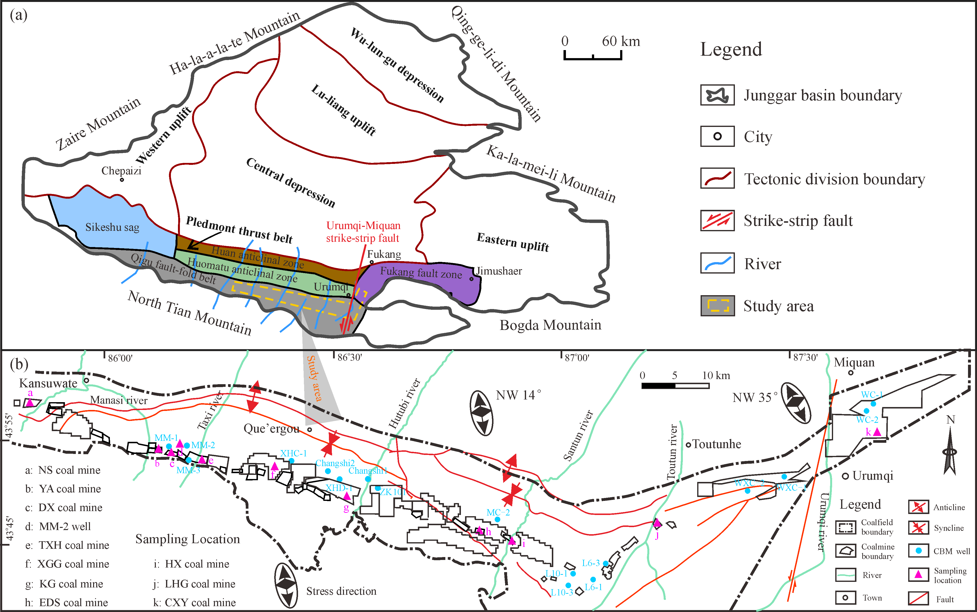 The Middle Jurassic Xishanyao Formation in the central section of the southern Junggar Basin has substantial amounts of low-ranked coalbed methane (CBM) recourses and is typically characterized by multi superimposed coal seams. To establish the CBM enrichment model, a series of experimental and testing methods were adopted, including coal maceral observation, pro-ximate analysis, low temperature nitrogen adsorption (LTNA), methane carbon isotope determination, porosity/permeability simulation caused by overburden, and gas content testing. The controlling effect of sedimentary environment, geological tectonic, and hydrogeological condition on gas content was analyzed in detail. The results demonstrate that the areas with higher gas content (an average of 8.57 m3/t) are mainly located in the Urumqi River-Santun River (eastern study area), whereas gas content (an average of 3.92 m3/t) in the Manasi River-Taxi River (western study area) is relatively low. Because of the combined effects of strata temperature and pressure, the gas content in coal seam first increases and then decreases with increasing buried depth, and the critical depth of the inflection point ranges from 600 m to 850 m. Affected by the changes in topography and water head height, the direction of groundwater migration is predicted from south to north and from west to east. Based on the gas content variation, the lower and middle parts of the Xishanyao Formation can be divided into three independent coal-bearing gas systems. Within a single gas-bearing system, there is a positive correlation between gas content and strata pressure, and the key mudstone layers separating each gas-bearing system are usually developed at the end of each highstand system tract. The new CBM accumulation model of the multi-coals mixed genetic gas shows that both biological and thermal origins are found in a buried depth interval between 600 m and 850 m, suggesting that the coals with those depths are the CBM enrichment horizons and favorable exploration regions in the middle section of the southern Junggar Basin. An in-depth discussion of the low-rank CBM enrichment model with multi-coal seams in the study region can provide a basis for the optimization of CBM well locations and favorable exploration horizons.