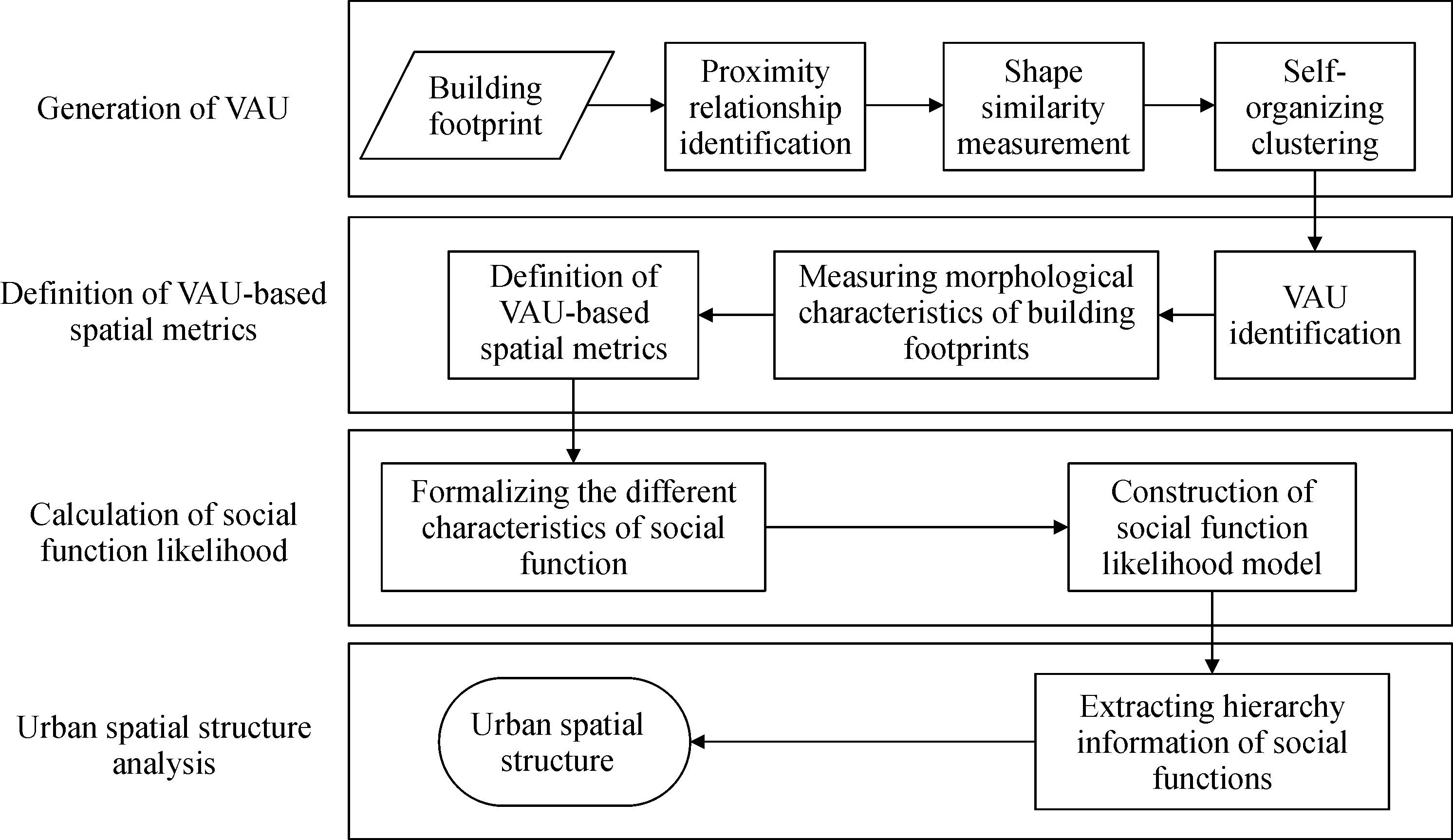 Analysis of urban spatial structures is an effective way to explain and solve increasingly serious urban problems. However, many of the existing methods are limited because of data quality and availability, and usually yield inaccurate results due to the unclear description of urban social functions. In this paper, we present an investigation on urban social function based spatial structure analysis using building footprint data. An improved turning function (TF) algorithm and a self-organizing clustering method are presented to generate the variable area units (VAUs) of high-homogeneity from building footprints as the basic research units. Based on the generated VAUs, five spatial metrics are then developed for measuring the morphological characteristics and the spatial distribution patterns of buildings in an urban block. Within these spatial metrics, three models are formulated for calculating the social function likelihoods of each urban block to describe mixed social functions in an urban block, quantitatively. Consequently, the urban structures can be clearly observed by an analysis of the spatial distribution patterns, the development trends, and the hierarchy of different social functions. The results of a case study conducted for Munich validate the effectiveness of the proposed method.