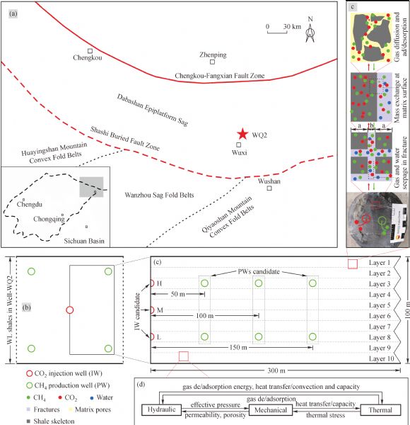 Regarding CO2 enhanced shale gas recovery, this work focuses on changes in the multiphase (free/adsorbed) CH4 in the process of CO2 enhanced shale gas recovery, by utilizing a rigorous numerical model with real geological parameters. This work studies nine injection well (IW) and CH4 production well (PW) combinations of CO2 to determine the influence of IW and PW locations on the dynamic interaction of multiphase CH4 during 10000 d of CO2 injection. The results indicate that the content of both the adsorbed CH4 and free CH4 is strongly variable before (and during) the CO2-CH4 displacement. In addition, during the simulation process, the proportion of the adsorbed CH4 among all extracted CH4 phases dynamically increases first and then tends to stabilize at 70%–80%. Moreover, the IW-PWs combinations significantly affect the outcomes of CO2 enhanced shale gas recovery – for both the proportion of adsorbed/free CH4 and the recovery efficiency. A longer IW-PW distance enables more adsorbed CH4 to be recovered but results in a lower efficiency of shale gas recovery. Basically, a shorter IW-PWs distance helps recover CH4 via CO2 injection if the IW targets the bottom layer of the Wufeng-Longmaxi shale formation. This numerical work expands the knowledge of CO2 enhanced gas recovery from depleted shale reservoirs.