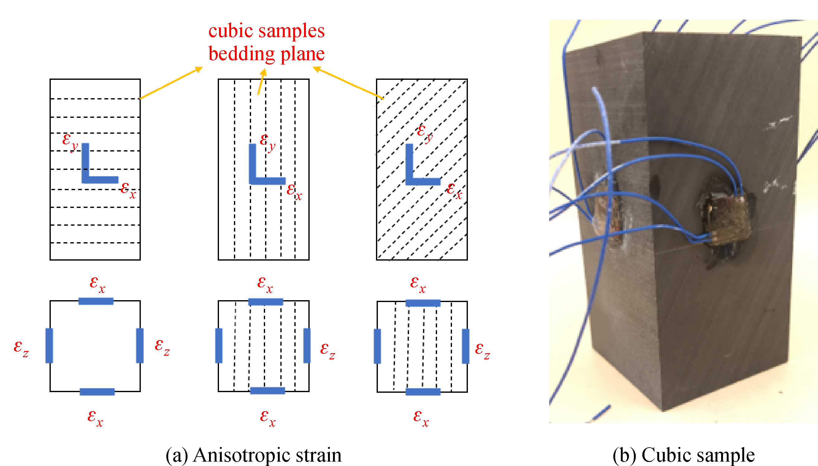 Understanding the damage behavior and cracking mechanism of brittle shale is crucial for hydraulic fracturing design. In this research, uniaxial compression tests are conducted on shale samples with different bedding plane orientations, and acoustic emission monitoring is implemented synchronously. The results indicate that the apparent elastic modulus increases with increasing bedding orientation. For the bedding orientations of 45° and 90°, the lateral deformation is anisotropic due to the bedding structure, revealing the anisotropic Poisson effect. A shear failure surface and tensile failure surfaces form parallel to the bedding plane for bedding orientations of 45° and 90°, respectively. For the bedding orientation of 0°, shear failure mainly occurs through the bedding planes. Additionally, the damage mechanism of shale is investigated by crack classification based on AE parameters. It is found that crack initiation is induced by the generation of shear cracks for the bedding orientation of 45°, whereas by the generation of tensile cracks for other bedding orientations. According to damage attributable to different type cracks, shear cracks dominate the damage behavior for bedding orientations of 0° and 45°, whereas tensile cracks dominate the damage behavior for bedding orientation of 90°. Finally, the information entropy is calculated by AE energy. A low value of information entropy, approximately 0.36, predicts failure with a low degree of instability for the bedding orientation of 0°, whereas a high value of information entropy, more than 1.5, predicts failure with a high degree of instability for other bedding orientations. This finding indicates that the failure behavior is gradual progressive damage for bedding orientation of 0°, whereas sudden damage dominates failure behavior for other bedding orientations.