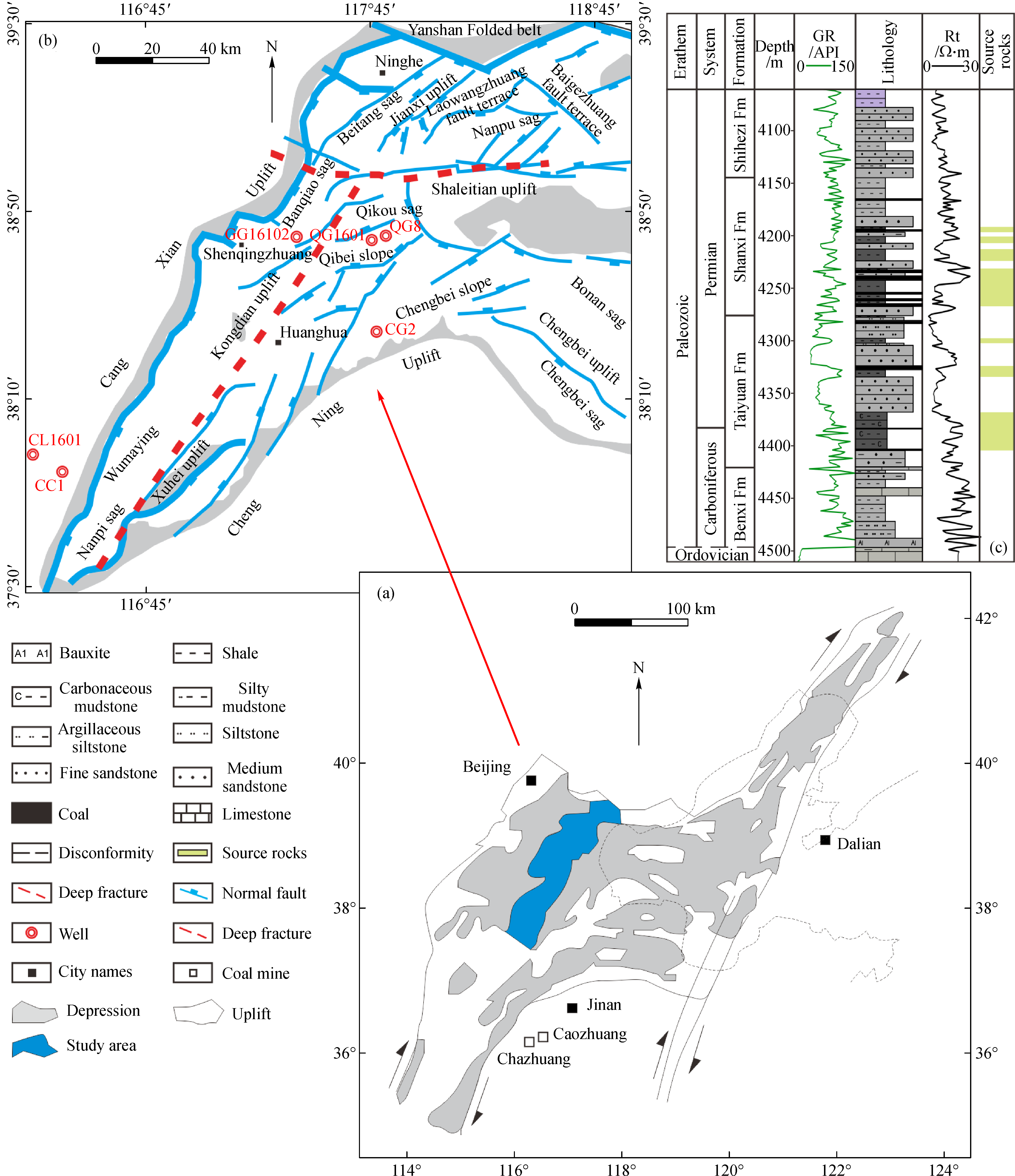 Although various coaly source rocks widely developed in the Carboniferous–Permian (C–P) of the Bohai Bay Basin, their geochemical characteristics and hydrocarbon generation potential are poorly understood. This study aims to discriminate the contribution of hydrocarbon generation from different C–P coaly source rocks and clarify the differences within generated oils using organic geochemistry, organic petrology, and thermal simulation experiments. The coaly source rocks containt coal clarain and durain, carbonaceous shale, and shale deposited in deltaic and lagoonal environment. The results indicated that clarain, durain, and carbonaceous shale exhibited higher hydrogen index and liquid–gas hydrocarbon yields than lagoonal and deltaic shales, which was mainly associated with the concentrations of sporinite, cutinite, and hydrogen-rich collodetrinite. Aliphatic hydrocarbons originated from coal and carbonaceous shale presented lower Ts/(Ts+Tm), Ga/17α(H)21β(H)-C30 hopane, 18α(H)-oleanane/17α(H)21β(H)-C30 hopane ratios, and higher 17β(H)21α(H)-C30 Morane/17α(H)21β(H)-C30 hopane than deltaic lagoonal shales. Parameters of aromatic hydrocarbons generated from five lithologies of coaly source rocks trended as clear group distribution, e.g., clarain and durain showing lower MNR, DBT/Fluorene (F) ratios and higher DBF/F ratio than coaly shales. The distinct descending trend of hydrocarbon potential is obtained from clarain, durain, carbonaceous shale to lagoonal and deltaic shales, implying dominated the petroleum and natural gas supplement from coal and carbonaceous shale. The difference between aliphatic and aromatic hydrocarbons provides a significant contribution to analyze the generic relationship between coaly source rock and lacustrine shale. Our results illustrate the importance of coaly source rocks for the in-depth oil-gas exploration of the Bohai Bay Basin and understanding hydrocarbon generation potential of source rocks in coal bearing strata.