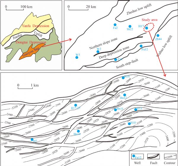 The sandstone of the third member of the Funing Formation (E1f3) in the northern slope zone of the Gaoyou Sag has the typical characteristics of high porosity and ultralow permeability, which makes it difficult for oil to flow. In this study, the lithological characteristics, sedimentary facies, diagenetic characteristics, pore structure, and seepage ability of this sandstone are characterized in detail. Correlation analysis is used to reveal the reason for the sandstone high porosity-low permeability phenomenon in the study area. The results indicate that this phenomenon is controlled mainly by the following three factors: 1) the sedimentary environment is the initial affecting factor, whereby the deposition of a large number of fine-grained materials reduces the primary pores of sandstone. 2) The Funing Formation has undergone strong compaction and cementation, which have led to the removal of most of the primary pores and a reduction in size of the throat channels. 3) Owing to fluid activity during the later stage of diagenesis, sandstone underwent intense dissolution and a large number of particles (feldspar and lithic debris) formed many dissolution pores (accounting for nearly 60% of the total pore space). Among these factors, dissolution has contributed the most to the development of high porosity-low permeability phenomenon. This is mainly attributed to the inhomogeneous dissolution process, whereby the degree of particle dissolution (e.g. feldspar) exceeds that of cementing minerals (clay and carbonate minerals). The secondary dissolution pores have increased the porosity of sandstone in the study area; however, the pore connectivity (permeability) has not been significantly improved, thus resulting in the special high porosity-low permeability characteristics of this sandstone.