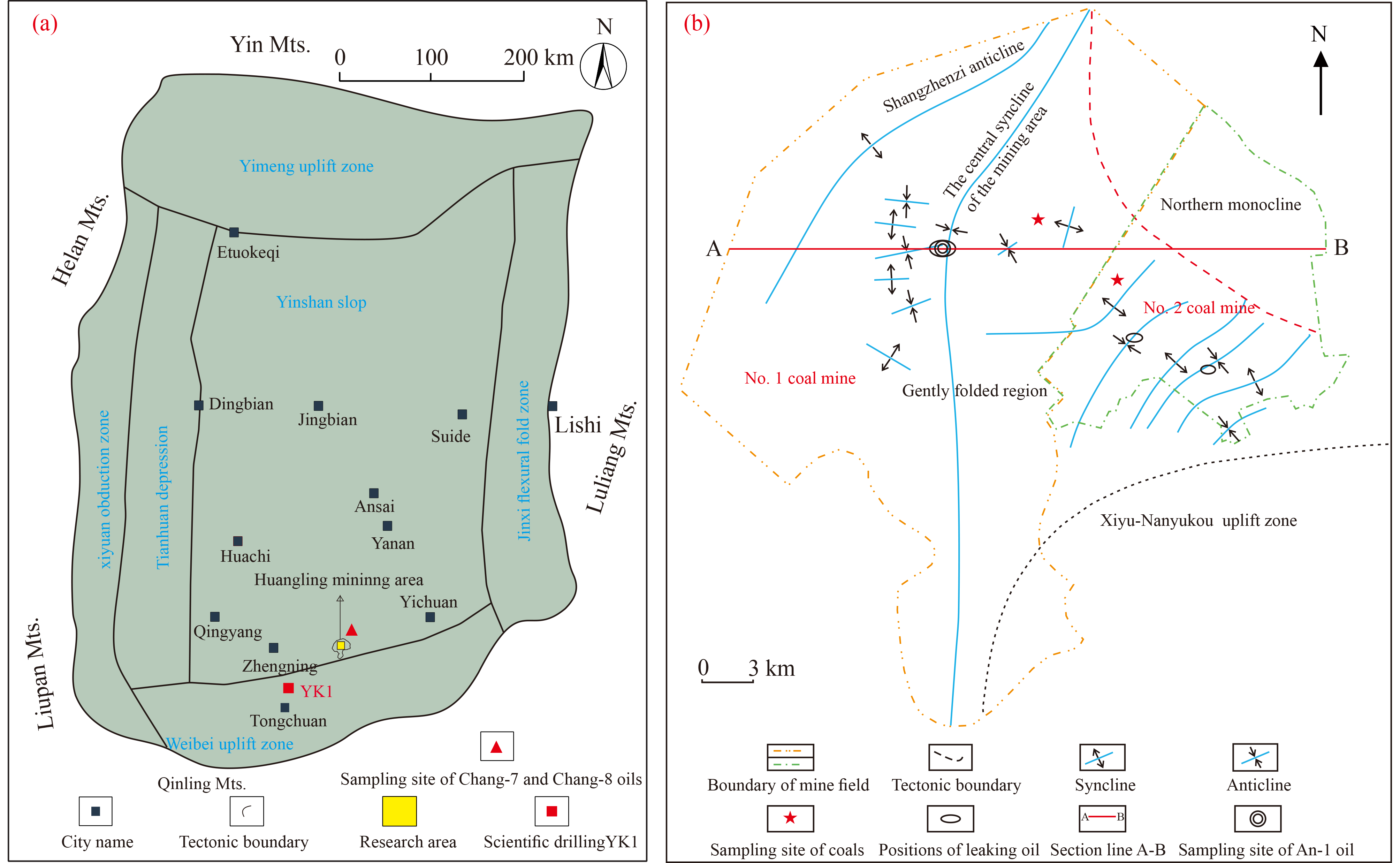 The Ordos Basin is an important intracontinental sedimentary basin in China, containing a significant amount of coal, oil, and natural gas. This study analyzed the sedimentary environment, sedimentary facies, parent material type, maturity, and carbon isotopic composition of the coal-bearing organic matter using gas chromatography–mass spectrometry (GC–MS) and stable isotope ratio mass spectrometry. The source of oil occurring in the No. 2 coal seam of the Jurassic Yan’an Formation (An-1 oil) and its accumulation model were also investigated. The results show that the relative abundances of C27, C28, and C29 steranes in the An-1 oil are 43.8%, 33.0%, and 23.2%, respectively. The tricyclic terpanes, C2920S/(20S + 20R), and C29ββ/(ββ+αα) contents of the An-1 oil are 31.4%−34.8%, 0.85 and 0.81, respectively. Pr/n-C17, Ph/n-C18, and Pr/Ph values are 0.34, 0.42, and 0.87, respectively. Biomarker parameters indicate that the An-1 oil mainly comes from the plankton source rock deposited in the freshwater lake facies and a reducing environment, which has evolved to maturity. The correlation of oil-oil indicates that the An-1 oil is homologous to the Chang-7 oil (Chang-7 member of the Triassic Yanchang Formation). The correlation of oil-source rock presents that the An-1 oil is generated from the Yanchang Formation (Chang-6 and Chang-7 source rocks) and occurred in the coal seam during the stage of stratum uplift since the Early of Late Cretaceous. The distribution characteristics of δ13Cgroup components in the An-1 oil and Chang-7 oil also reveal the fractionation phenomenon during the migration of crude oil.