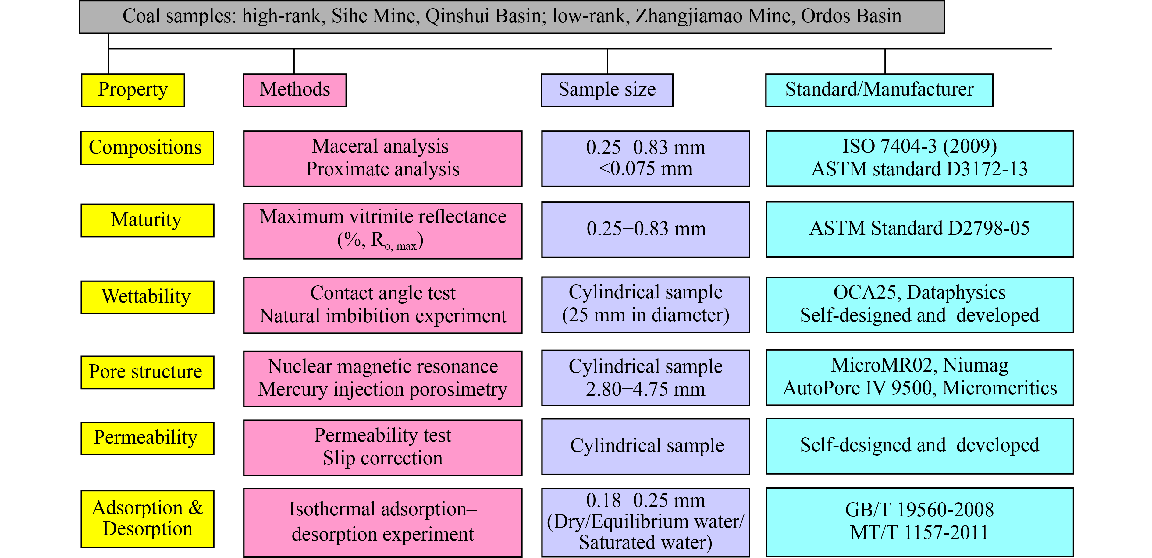 High- and low-rank coalbed methane (CBM) are both important fields of CBM development in China, but their formation and production mechanisms differ considerably. The adsorption/desorption behavior of high- and low-rank coals under the coupling of coal–water–gas was investigated using two series of samples. Coal samples from Zhangjiamao (ZJM) coal mine, Ordos basin, and Sihe (SH) coal mine, Qinshui basin, were tested by isothermal adsorption–desorption experiment, natural imbibition experiment, nuclear magnetic resonance, mercury injection porosimetry, contact angle test, and permeability test. Isothermal adsorption and desorption experiments under dry, equilibrium water, and saturated water, were performed to explore the differences between the adsorption and desorption characteristics. The results show that the wettability and permeability of the ZJM low-rank coal sample was considerably higher than that of the SH high-rank coal sample. The imbibition process of the ZJM sample exhibited a high imbibition rate and high total-imbibition volume, whereas the SH sample exhibited a slow imbibition rate and low total-imbibition volume. The ZJM sample had a complex pore structure and diverse pore-size distribution with a lower mercury withdrawal efficiency at 59.60%, whereas the SH sample had a relatively uniform pore-size distribution with a higher mercury withdrawal efficiency at 97.62%. The response of adsorption and desorption of the ZJM sample to water was more significant than that of the SH sample. The desorption hysteresis of the ZJM sample was stronger than that of the SH sample and was more prominently affected by water, which was consistent with its strong wettability and complex pore-throat configuration. A comprehensive adsorption and desorption mode was constructed for high- and low-rank coal samples under coal–water–gas coupling condition. The research results are important to enrich the geological theory of high- and low-rank CBM and to guide efficient CBM recovery.
