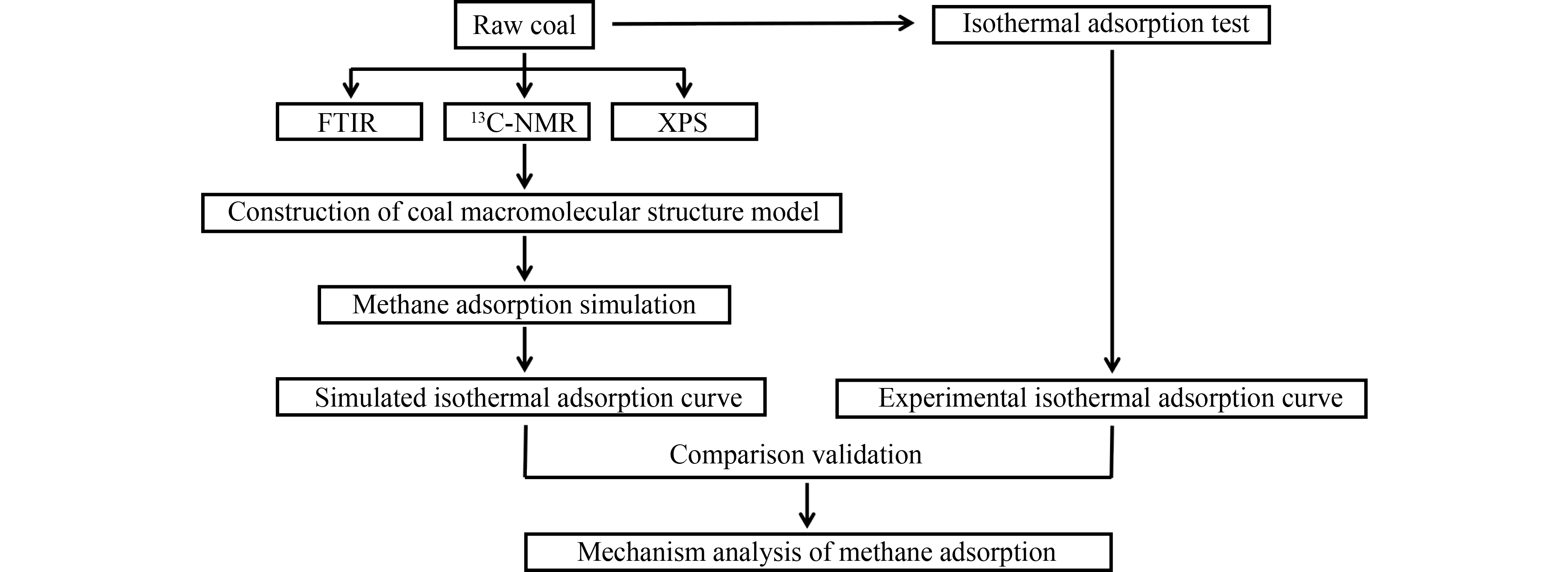 The adsorption, diffusion, and aggregation of methane from coal are often studied based on slit or carbon nanotube models and isothermal adsorption and thermodynamics theories. However, the pore morphology of the slit model involves a single slit, and the carbon nanotube model does not consider the molecular structure of coal. The difference of the adsorption capacity of coal to methane was determined without considering the external environmental conditions by the molecular structure and pore morphology of coal. The study of methane adsorption by coal under single condition cannot reveal its mechanism. In view of this, elemental analysis, FTIR spectrum, XPS electron energy spectrum, 13C NMR, and isothermal adsorption tests were conducted on the semi-anthracite of Changping mine and the anthracite of Sihe Mine in Shanxi Province, China. The grand canonical Monte Carlo (GCMC) and molecular dynamics simulation method was used to establish the coal molecular structure model. By comparing the results with the experimental test results, the accuracy and practicability of the molecular structure model are confirmed. Based on the adsorption potential energy theory and aggregation model, the adsorption force of methane on aromatic ring structure, pyrrole nitrogen structure, aliphatic structure, and oxygen-containing functional group was calculated. The relationship between pore morphology, methane aggregation morphology, and coal molecular structure was revealed. The results show that the adsorption force of coal molecular structure on methane is as follows: aromatic ring structure (1.96 kcal/mol) > pyridine nitrogen (1.41 kcal/mol) > pyrrorole nitrogen (1.05 kcal/mol) > aliphatic structure (0.29 kcal/mol) > oxygen-containing functional group (0.20 kcal/mol). In the long and narrow regular pores of semi-anthracite and anthracite, methane aggregates in clusters at turns and aperture changes, and the adsorption and aggregation positions are mainly determined by the aromatic ring structure, the positions of pyrrole nitrogen and pyridine nitrogen. The degree of aggregation is controlled by the interaction energy and pore morphology. The results pertaining to coal molecular structure and pore morphology on methane adsorption and aggregation location and degree are conducive to the evaluation of the adsorption mechanism of methane in coal.