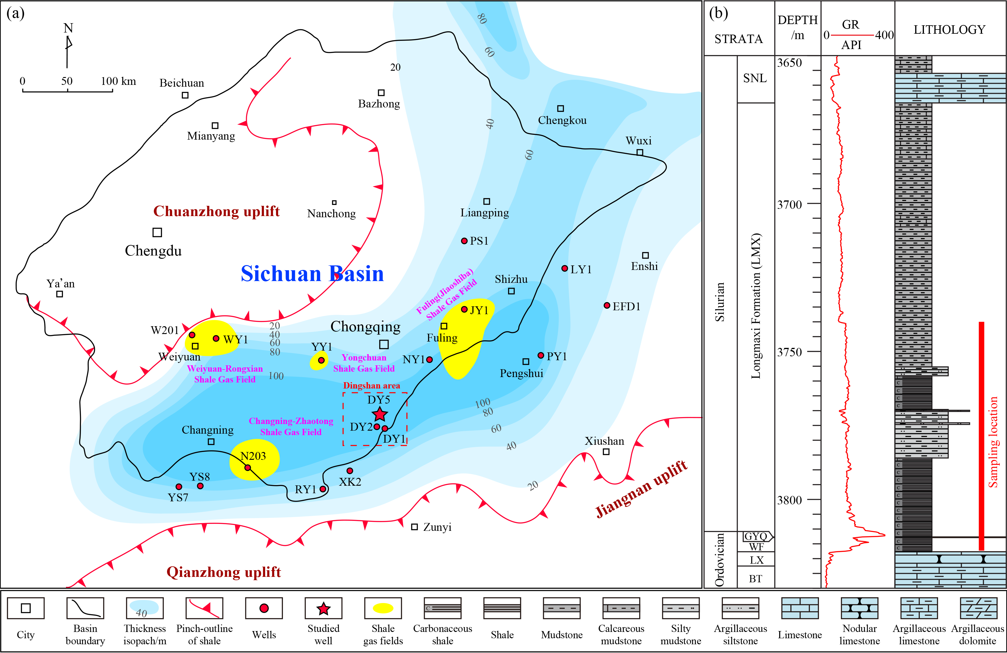 Recently, deeply-buried shale (depth > 3500 m) has become an attractive target for shale gas exploration and development in China. Gas-in-place (GIP) is critical to shale gas evaluation, but the GIP content of deep shale and its controlling factors have rarely been investigated. To clarify this issue, an integrated investigation of deep gas shale (3740–3820 m depth) of the Lower Paleozoic Wufeng–Longmaxi Formations (WF–LMX) in the Dingshan area, Sichuan Basin had been carried out. Our results show that the GIP content of the studied WF–LMX shale in the Dingshan area ranges from 0.85 to 12.7 m 3/t, with an average of 3.5 m3/t. Various types of pores, including organic matter (OM) pore and inorganic pore, are widely developed in the deep shale, with total porosity of 2.2 to 7.3% (average = 4.5%). The OM pore and clay-hosted pore are the dominant pore types of siliceous shale and clay-rich shale, respectively. Authigenic quartz plays a critical role in the protection of organic pores in organic-rich shales from compaction. The TOC content controls the porosity of shale samples, which is the major factor controlling the GIP content of the deep shale. Clay minerals generally play a negative role in the GIP content. In the Sichuan Basin, the deep and ultra-deep WF–LMX shales display the relatively high porosity and GIP contents probably due to the widespread of organic pores and better preservation, revealing great potentials of deep and ultra-deep shale gas. From the perspective of rock mechanical properties, deep shale is the favorable exploration target in the Sichuan Basin at present. However, ultra-deep shale is also a potential exploration target although there remain great challenges.