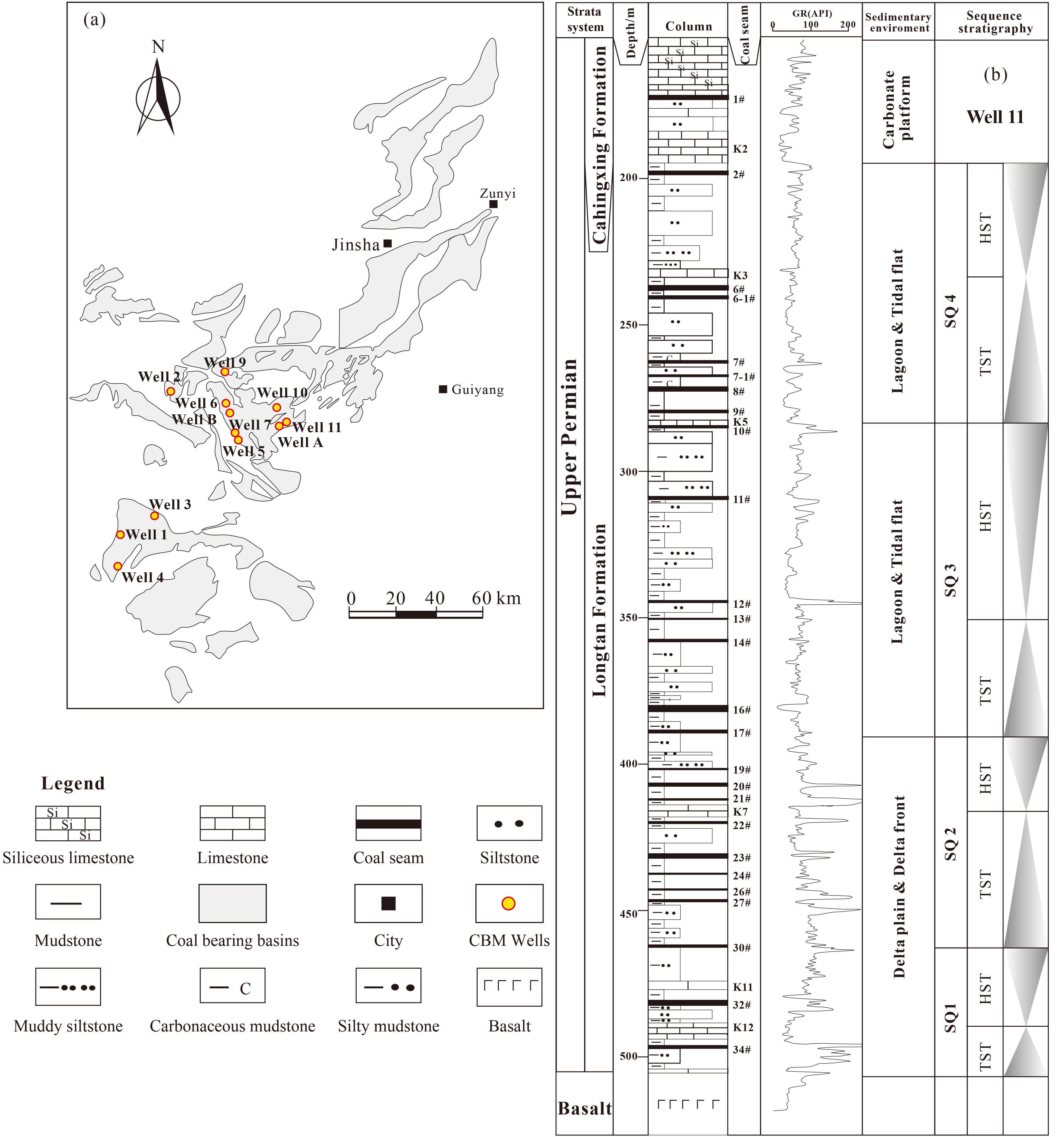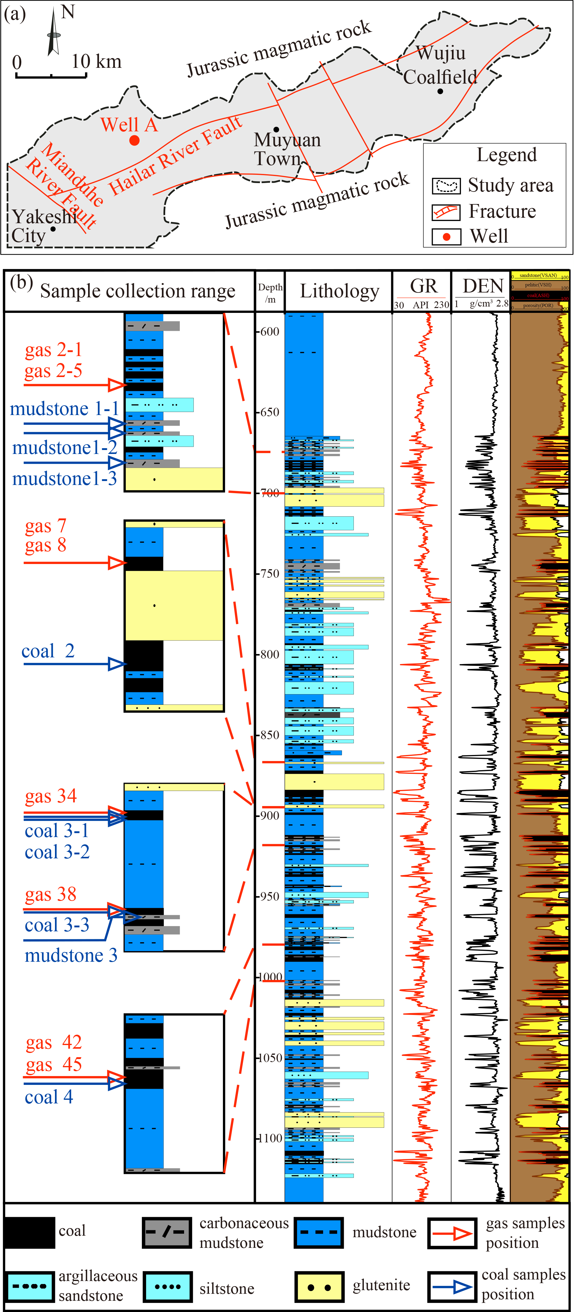 To understand the natural gas characteristics of multi-thin coal seam, this study selected the desorbed gas of coal seams in different layers of Well A in the Wujiu depression, Hailar Basin in northeast Inner Mongolia. The results show that the heavy hydrocarbon content of desorbed gas increases significantly with the increasing depth. Methane carbon (δ13C1) and ethane carbon (δ13C2) isotope values are vertically become heavier downwards, while the δ13 values did not change significantly. The kerogen is close to the III–II mixed type with the source rocks mainly deposited in a shore/shallow lake or braided-river delta front, and the gas produced has certain characteristics of oil associated gas. However, the characteristics of oil associated gas produced by the organic formed in the shallow-water environment (braided-river delta plain) are not obvious. The sandstone pore and fracture systems interbedded with multi-thin coal seam are well developed. And it is conducive to the migration of methanogenic micro-organisms to coal seams via groundwater, making it easier to produce biogenic gas under this geological condition. During the burial evolution of coal-bearing strata in the study area, when the burial depth reaches the maximum, there are significant differences in the paleotemperature experienced by different vertical coal seams, caused by a high-paleogeothermal gradient, increasing the δ13C2 of desorbed gas with increasing depth. The above research indicates that there is less biogenic gas in the multi-thin coal seams with relatively developed mudstone, and the multi-thin coal seams with relatively developed sandstones have obvious biogenic gas characteristics. Therefore, for the exploration and development of biogenic gas in low-rank multi-thin coal seams, it is necessary to give priority to the layer with high sandstone content.
