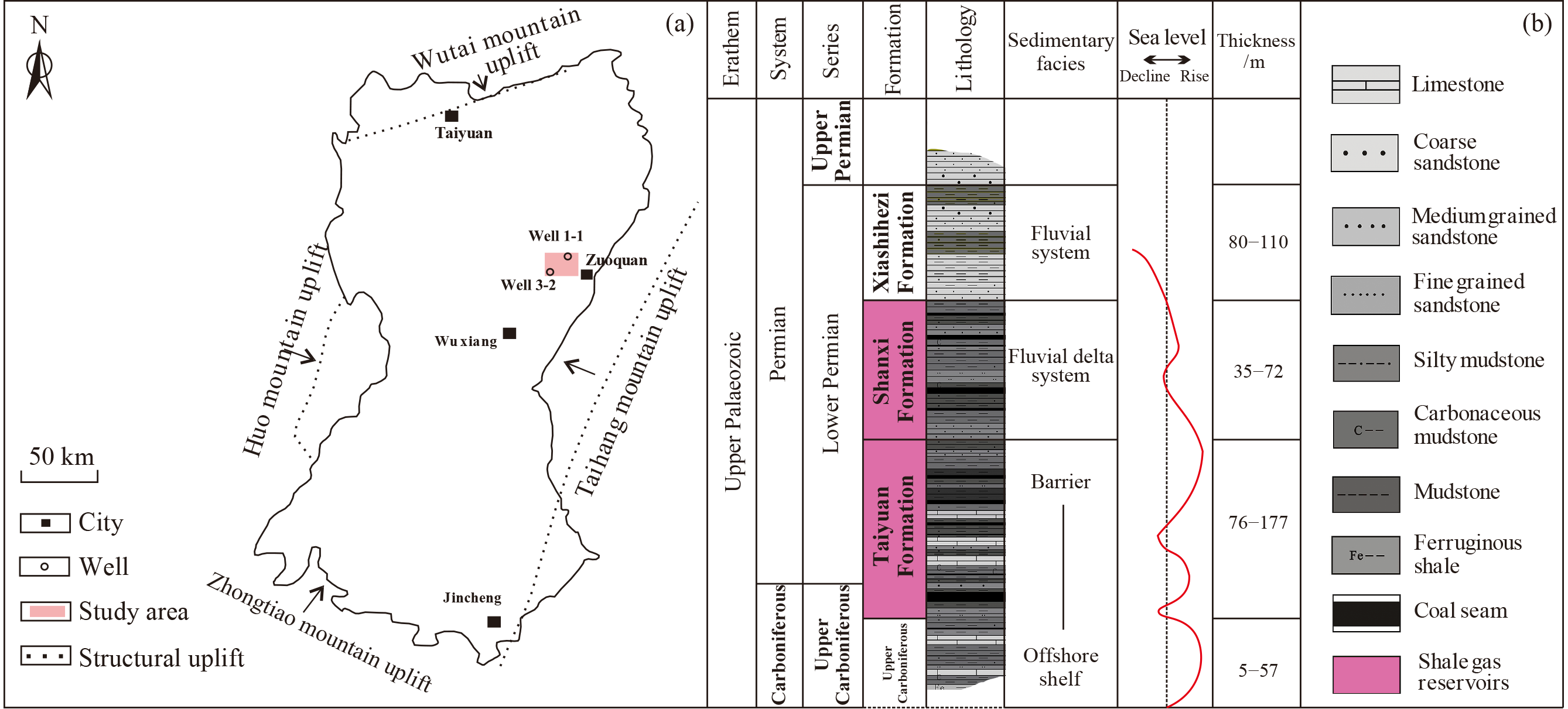 Coal-bearing shale shows great potential for unconventional gas resources in China, while its exploration and development have been challenging for a long time. Gas-in-place (GIP) is critical to shale gas evaluation, but the major factors controlling the GIP content of coal-bearing shale remain unclear. To address this issue, the coal-bearing shales of the upper Carboniferous-lower Permian Taiyuan and Shanxi formations in the Zuoquan Block, Qinshui Basin, China, were collected for GIP measurements and an integrated investigation, including organic geochemistry, inorganic mineral compositions, and pore characterizations, was carried out. Our results show that the GIP content of the studied shales displays relatively low values and wide variations, which range from 0.30 to 2.28 m3/t. The GIP is dominated by desorbed gas and residual gas. Total organic carbon (TOC) contents of the studied shales vary from 0.92% to 16.91%, and inorganic minerals are dominated by clays that mainly consist of illite/smectite mixed layer (I/S) and kaolinite. Inorganic pores have been widely observed in the studied shales, while the organic matter-hosted pores are rarely found using SEM observations. Total porosity of the studied shales is primarily contributed by clay minerals, followed by organic matter and quartz. Weak positive relationships between the GIP content and pore structure parameters imply that the adsorption of methane to nanopores is relatively weak, which may be attributed to the hydrophilicity of clay-hosted pores. Moreover, hydrophobic organic pores are not well developed. Positive correlations between the GIP contents and contents of TOC, clays, and the I/S indicate that major factors influencing the GIP contents of the coal-bearing shales are clays (especially I/S) and TOC content. In summary, these findings would be very helpful to reveal the enrichment mechanism of coal-bearing shale gas and provide a scientific basis for the exploration and development of coal-bearing shale gas.