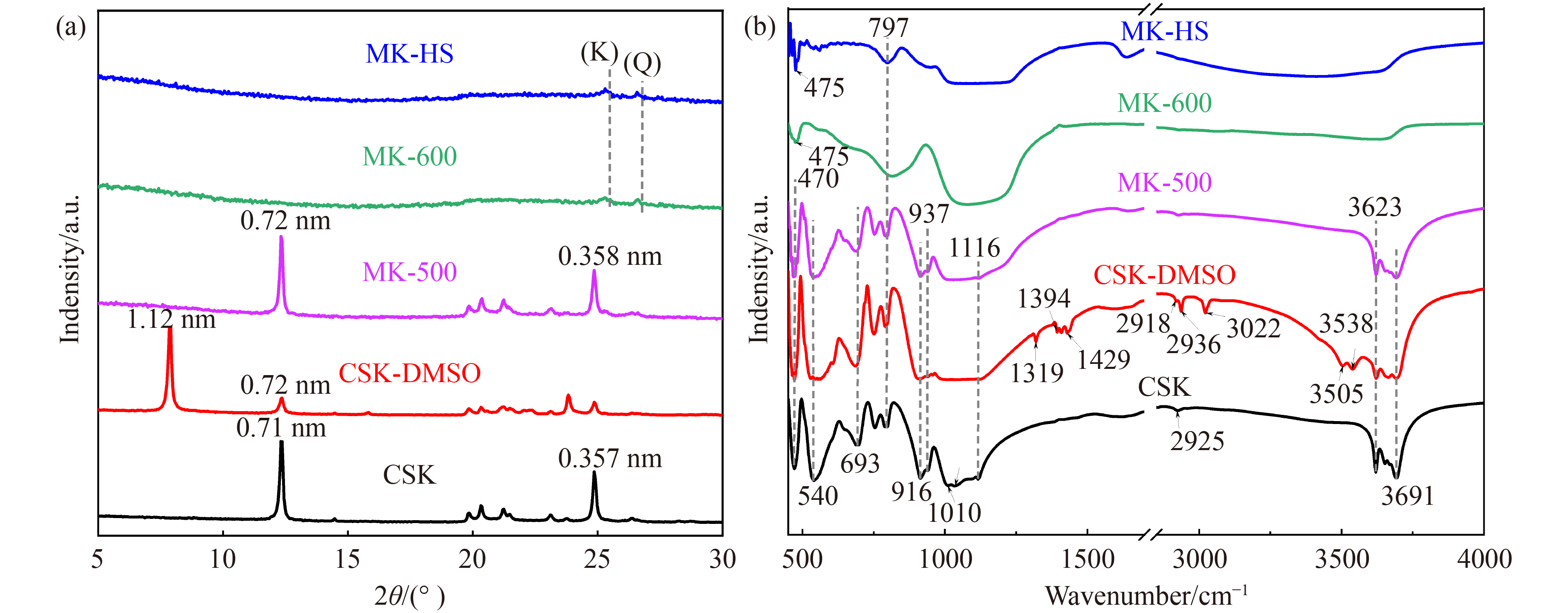 The sharp increase in the demand for lithium (Li) for high-energy-storage battery materials due to its high specific energy and low negative chemical potential render Li a geopolitically significant resource. It is urgent to develop a low-cost, efficient method to improve lithium extraction. Herein, Li ion (Li+) adsorption in coal-bearing strata kaolinite (CSK) was studied. The effects of pre-activation acid leaching (meta-kaolinite/H2SO4, MK-HS) and dimethyl sulfoxide intercalation (coal-bearing strata kaolinite/dimethyl sulfoxide, CSK-DMSO) on the Li+ adsorption capacity were studied under the same adsorption conditions. The results indicated that the adsorption was completed in 60 min under alkaline conditions (pH = 8.5), a high solution concentration (400 mg/L), and a low dosage (1 g/100 mL); and the comprehensive adsorption capacity is MK-HS > CSK-DMSO > CSK. Furthermore, the DMSO intercalation caused the interlayer spacing of the CSK to increase, which provided more space for Li+ to enter and increase the adsorption capacity. After thermal pre-activation and acid leaching, structural failure and lattice collapse resulted in the presence of more micropores in the MK-HS, which resulted in a 10-fold increase in its specific surface area and caused coordination bond changes (Al(VI) to Al(IV)) and leaching of aluminum (Al) from the lattice. It is proposed that these structural changes greatly improve the activity of CSK so that Li+ cannot only adsorb onto the surface and between the layers but can also enter the lattice defects, which results in the MK-HS having the best adsorption performance. Combined with the adsorption kinetics analysis, the adsorption methods of CSK and two modified materials include physical adsorption and chemical adsorption. In this study, the adsorption capacity of CSK and its modified products to Li were explored, providing a new option for the reuse of CSK and the extraction of Li.