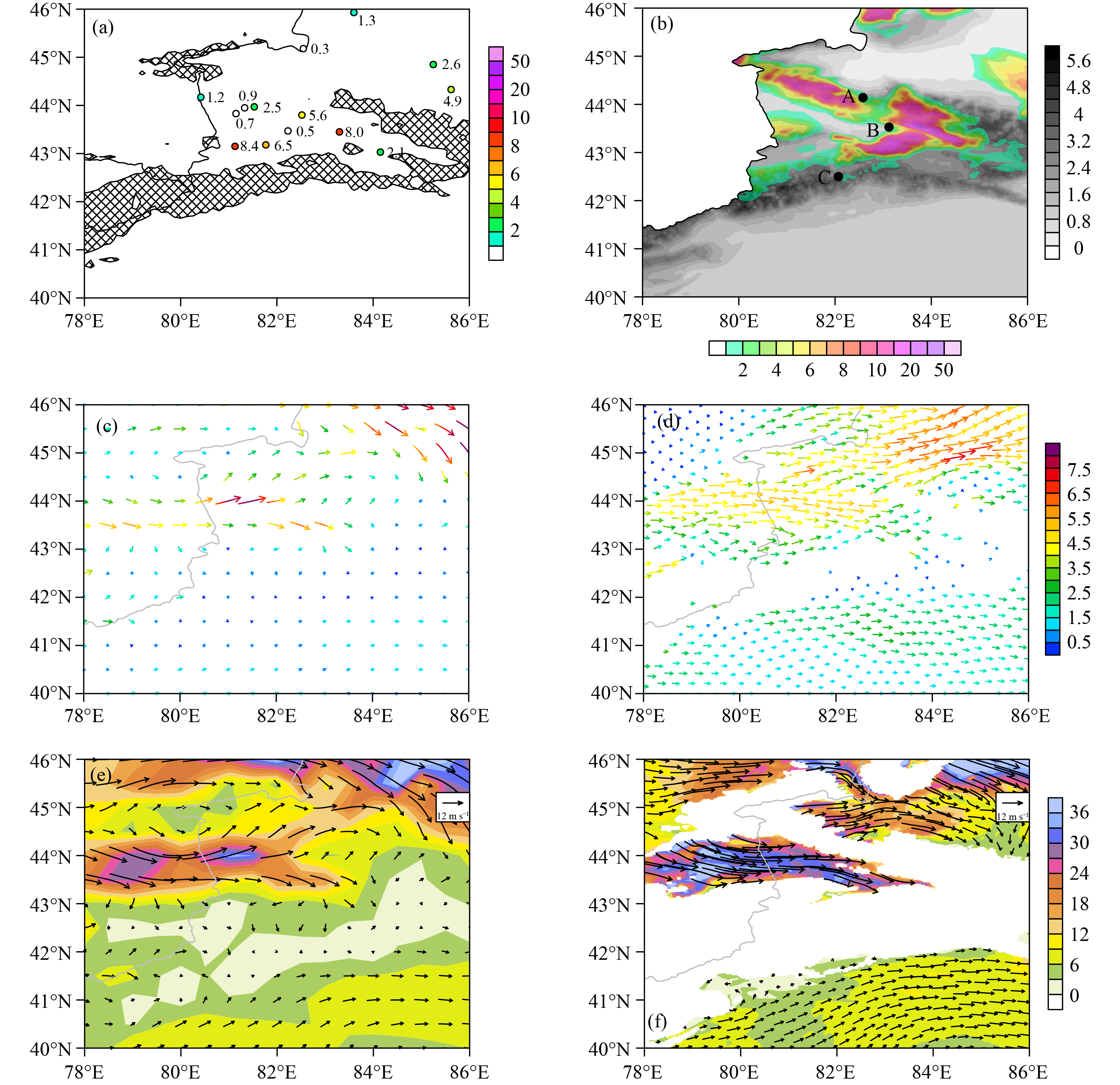 The characteristics of the mesoscale gravity waves during a snowfall event on November 30, 2018 over the Ili Valley and the northern slope of the Tianshan Mountains are analyzed based on the Weather Research and Forecasting model simulation. The vertical distribution of is similar to that of the residual of the nonlinear balance equation (), with their high-value areas located over the leeward slope and the fluctuations extending upwardly with time, indicating the characteristics of strong ageostrophy and non-equilibrium of atmospheric motions. In addition, the and are first developed in the lower layers over the leeward slope, revealing that the generation of the gravity waves is closely related to the topography. Thus, the topographic uplifting greatly affects this snowfall, and the ageostrophic motion in the whole troposphere and the lower stratosphere, as well as the unbalanced motions between convergence and divergence over the peak and the leeward slope are conductive to the development of the inertia-gravity waves. In terms of the horizontal scale of the gravity waves, the Barnes’ band-pass filter is applied to separate the mesoscale waves and the synoptic-scale basic flow. The vertical distributions of the vorticity and divergence perturbations have a phase difference of π/2, indicating the polarization state of gravity waves. The analyses on the sources and sinks of gravity waves by the non-hydrostatic wave equation show that the main forcing term for orographic gravity waves is the second-order nonlinear term, whose magnitude mainly depends on the nonlinear thermal forcing. This term is mainly related to the vertical transport of potential temperature perturbations. During the snowfall, the potential temperature perturbations are mainly caused by the topographic relief and the release of condensation latent heat. Therefore, the gravity waves in this snowfall are caused by the topographic forcing and condensation latent heating.