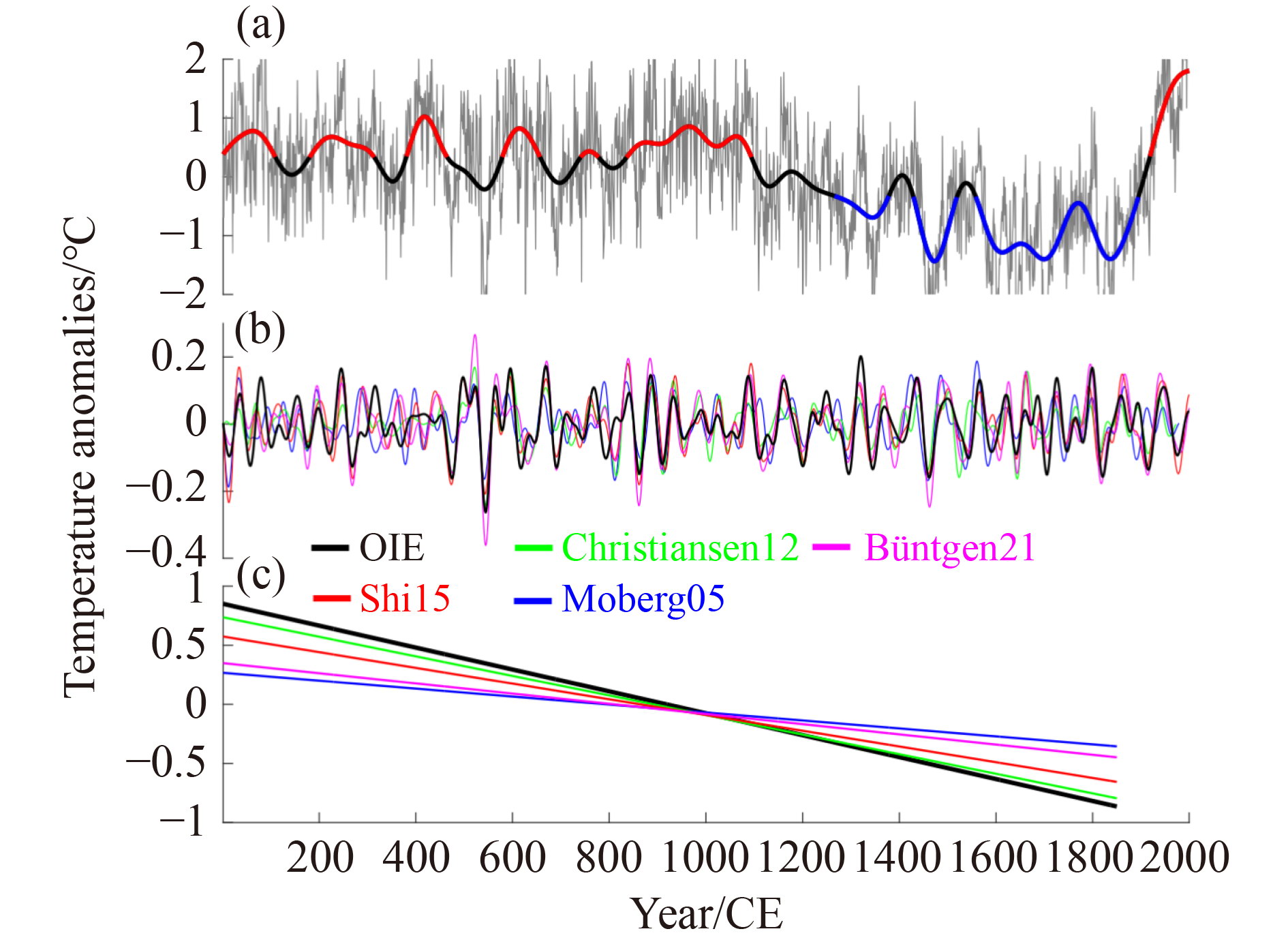 Quantitative assessment of natural internal variability and externally forced responses of Northern Hemisphere (NH) temperatures is necessary for understanding and attributing climate change signals during past warm and cold periods. However, it remains a challenge to distinguish the robust internally generated variability from the observed variability. Here, large-ensemble (70 member) simulations, Energy Balance Model simulation, temperature ensemble reconstruction, and three dominant external forcings (volcanic, solar, and greenhouse gas) were combined to estimate the internal variability of NH summer (June–August) temperatures over the past 2000 years (1–2000 CE). Results indicate that the Medieval Climate Anomaly was predominantly attributed to centennial-scale internal oscillation, accounting for an estimated 104% of the warming anomaly. In contrast, the Current Warm Period is influenced mainly by external forcing, contributing up to 90% of the warming anomaly. Internal temperature variability offsets cooling by volcanic eruptions during the Late Antique Little Ice Age. These findings have important implications for the attribution of past climate variability and improvement of future climate projections.