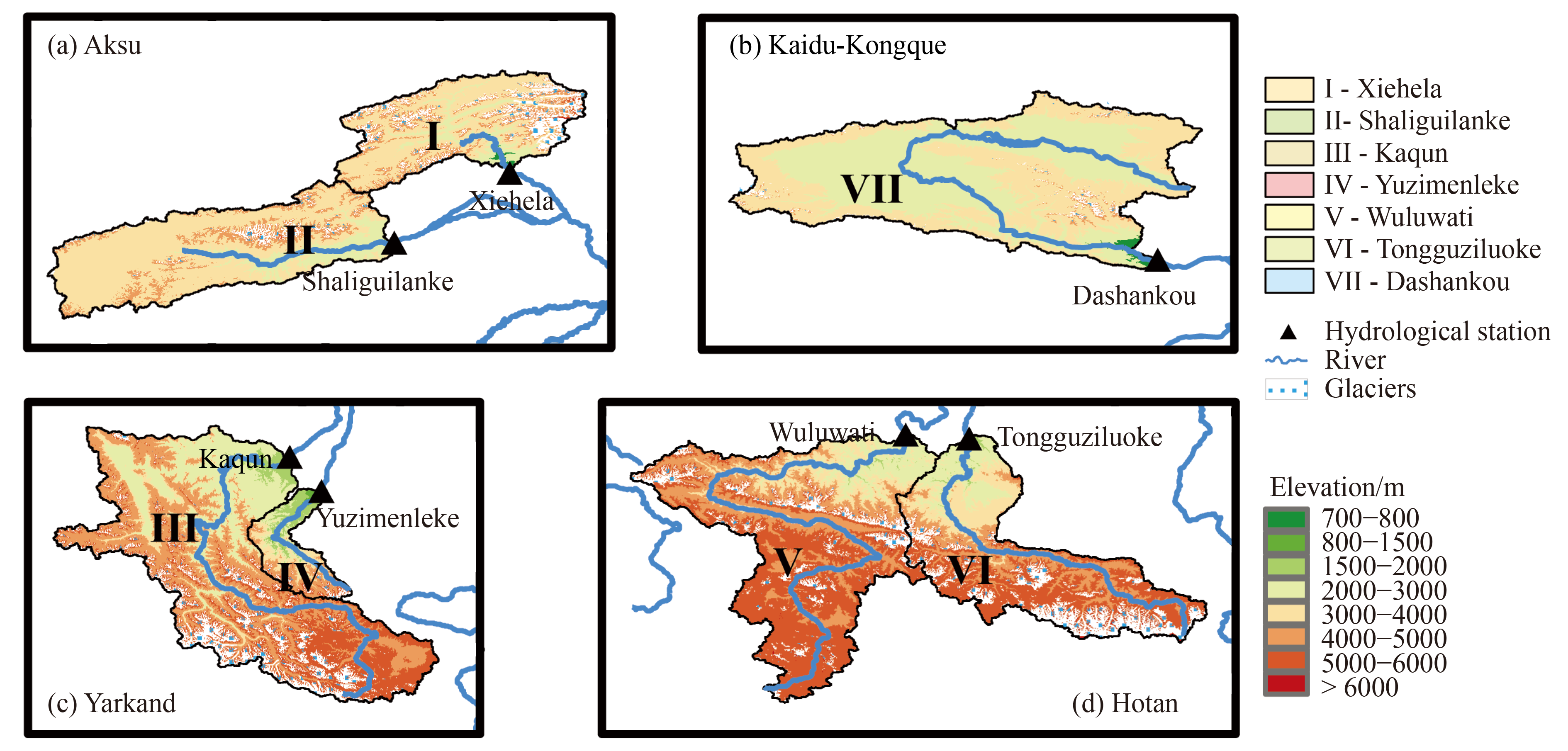 Understanding the main drivers of runoff components and contributions of precipitation and temperature have important implications for water-limited inland basins, where snow and glacier melt provide essential inputs to surface runoff. To quantify the impact of temperature and precipitation changes on river runoff in the Tarim River basin (TRB), the Hydrologiska Byrans Vattenbalansavdeling (HBV)-light model, which contains a glacier routine process, was applied to analyze the change in runoff composition. Runoff in the headstream parts of the TRB was more sensitive to temperature than to precipitation. In the TRB, overall, rainfall generated 41.22% of the total runoff, while snow and glacier meltwater generated 20.72% and 38.06%, respectively. These values indicate that temperature exerted more major effects on runoff than did precipitation. Runoff compositions were different in the various subbasins and may have been caused by different glacier coverages. The runoff volumes generated by rainfall, snowmelt, glacier melt was almost equal in the Aksu River subbasin. In the Yarkand and Hotan River subbasins, glacier meltwater was the main supplier of runoff, accounting for 46.72% and 58.73%, respectively. In the Kaidu-Kongque River subbasin, 80.86% was fed by rainfall and 19.14% was fed by snowmelt. In the TRB, runoff generated by rainfall was the dominant component in spring, autumn, winter, while glacier melt runoff was the dominant component in summer. Runoff in the TRB significantly increased during 1961–2016; additionally, 56.49% of the increase in runoff was contributed by temperature changes, and 43.51% was contributed by precipitation changes. In spring, the runoff increase in the TRB was mainly caused by the precipitation increase, opposite result in summer and autumn. Contribution of temperature was negative in winter. Our findings have important implications for water resource management in high mountainous regions and for similar river basins in which melting glaciers strongly impact the hydrological cycle.